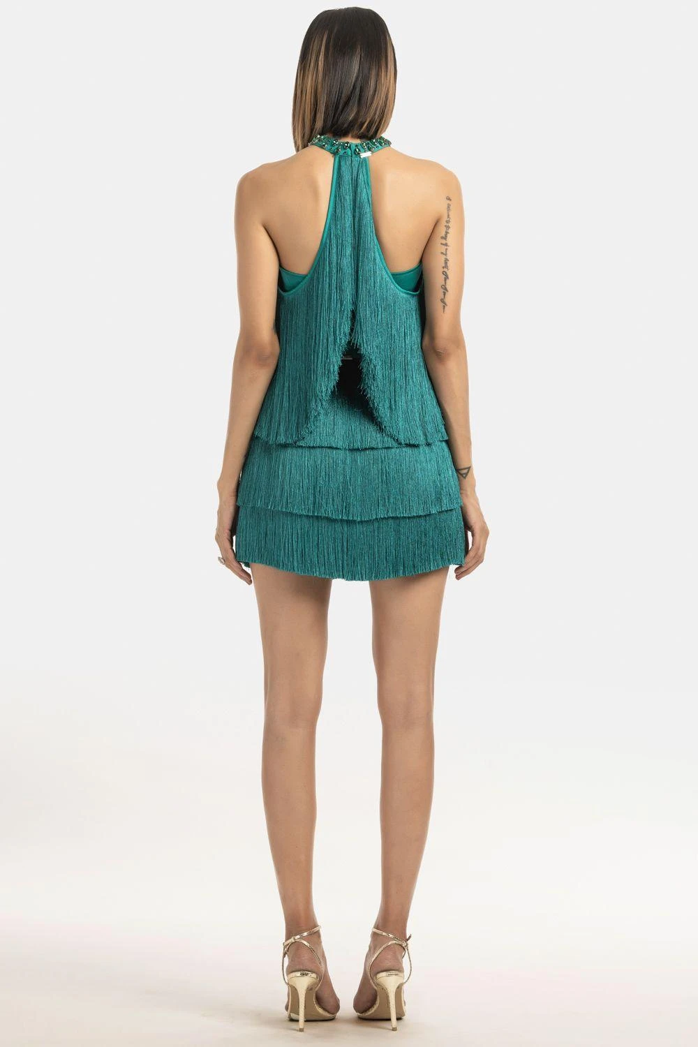 Look efforlessly stylish in this green mini skirt. It featured fringe details all over and closes on the side with a concealed zip. Style this top with a matching fringe top for a coordinated look.