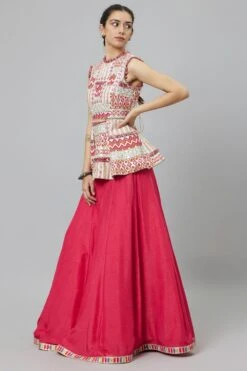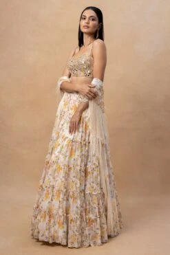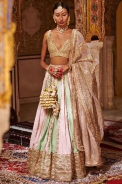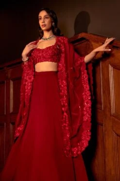Embrace the epitome of elegance with this gota embellished lehenga. Adorned with intricate gota work, this captivating ensemble exudes grace & sophistication. Paired with a neutral shade dupatta, it creates a harmonious balance of understated allure.