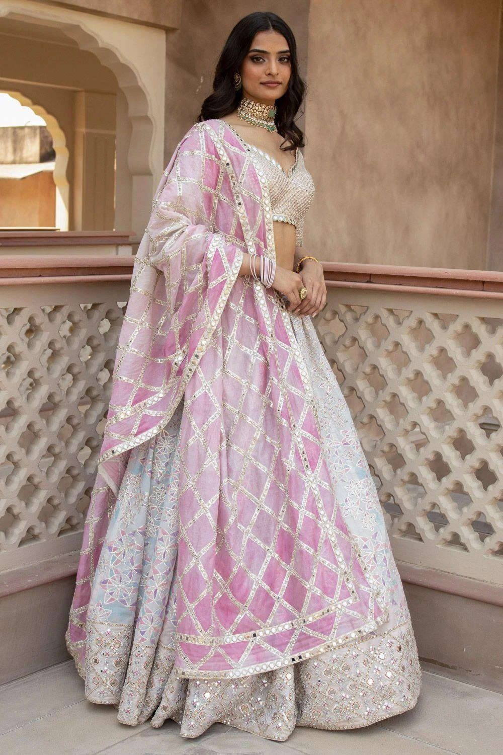 Step into the realm of exquisite beauty with this gota mirror embellished lehenga set. The intricately adorned blouse, featuring stunning mirror work, harmonizes effortlessly with the printed gotta skirt & dupatta, creating a mesmerizing ensemble.