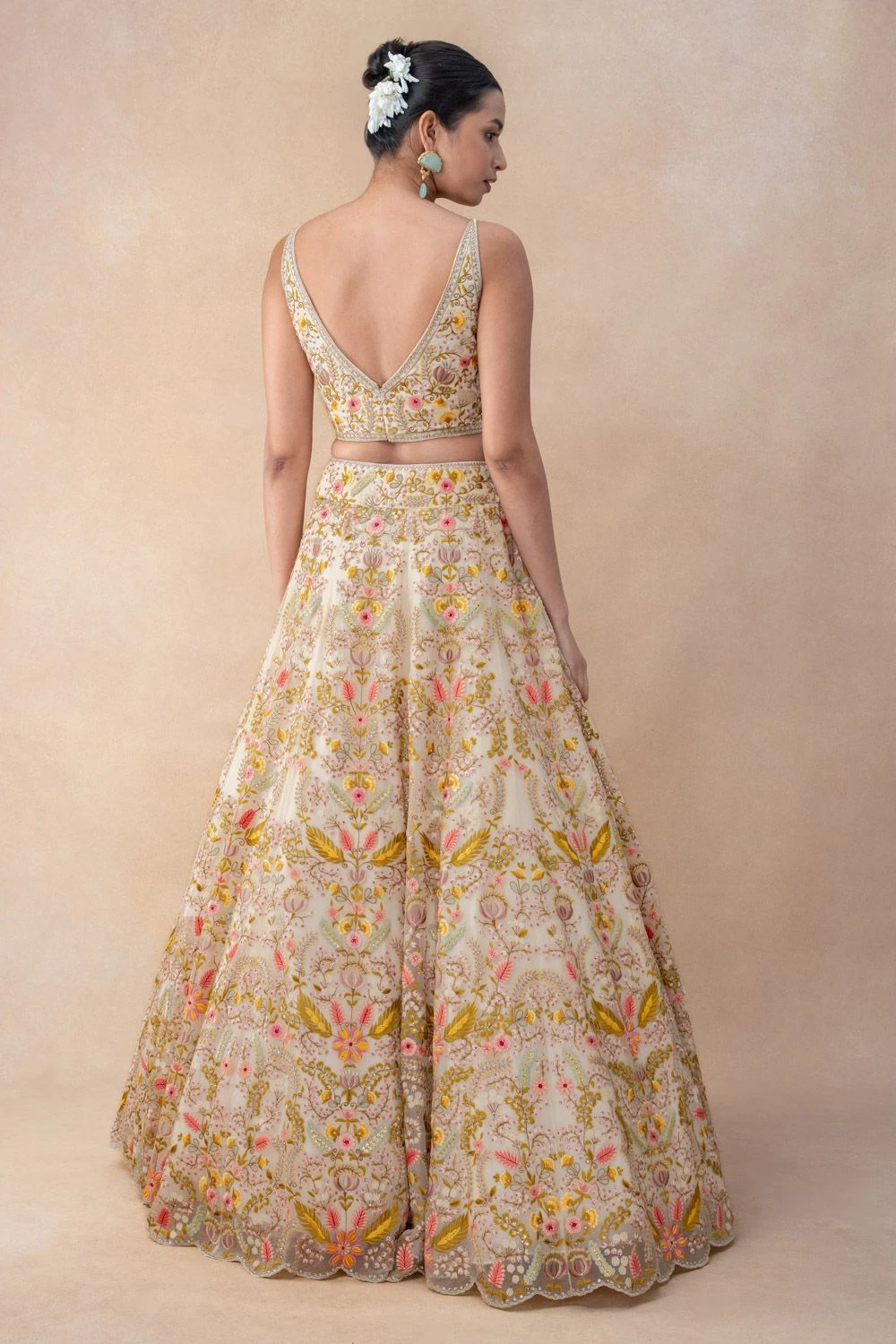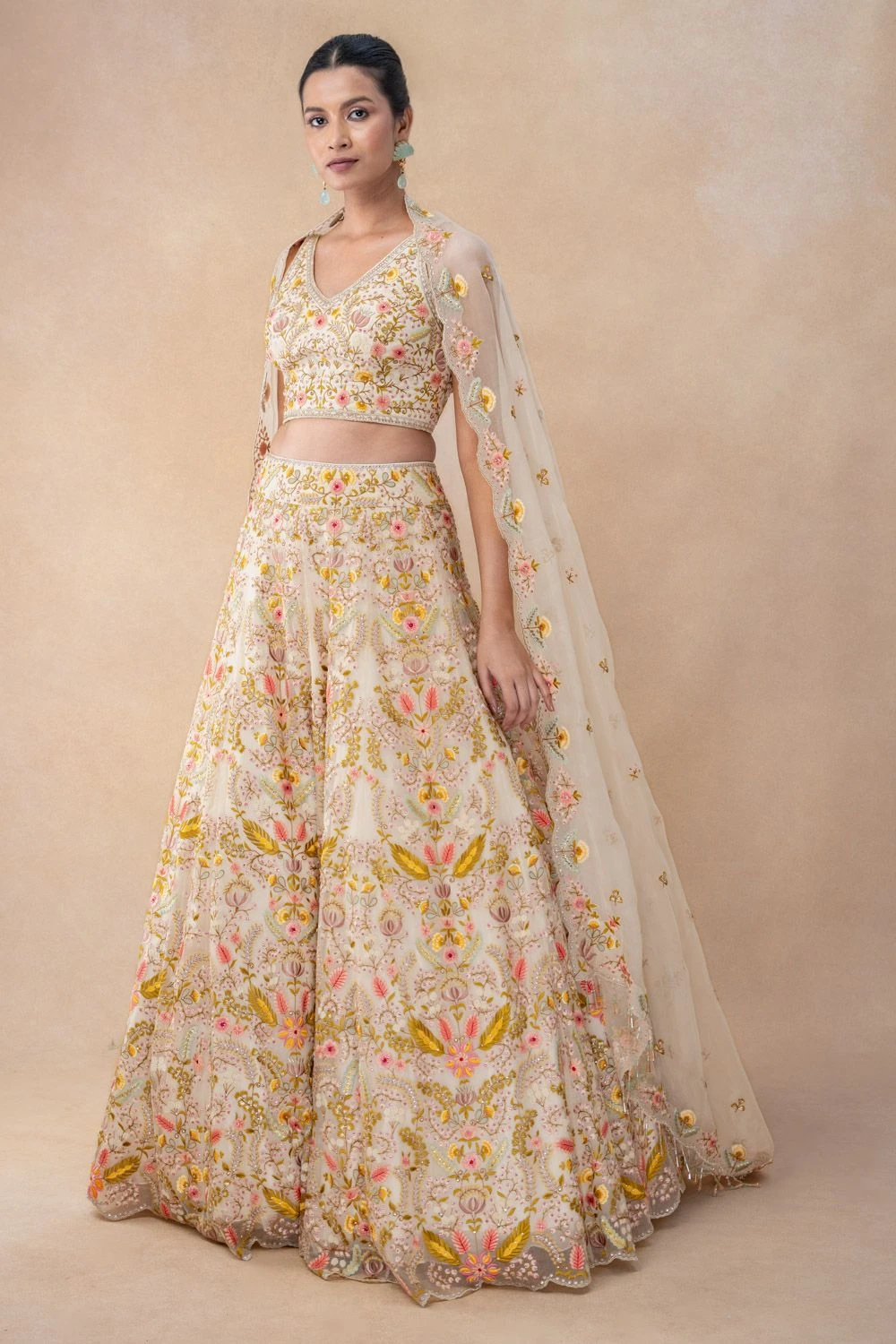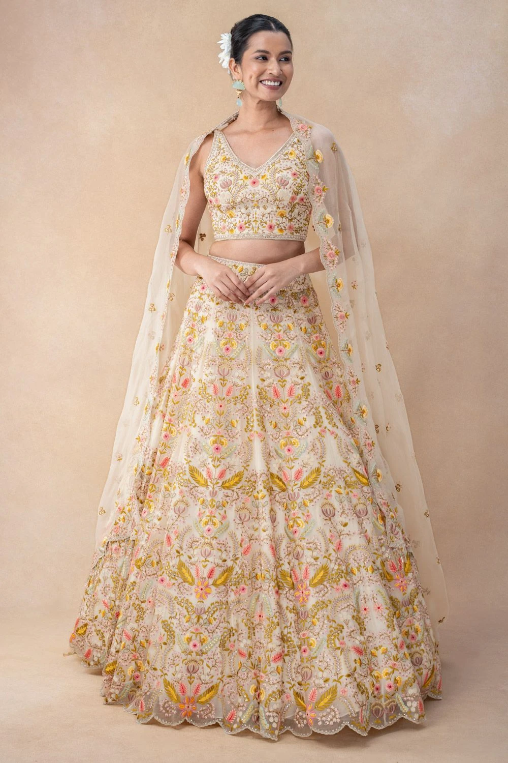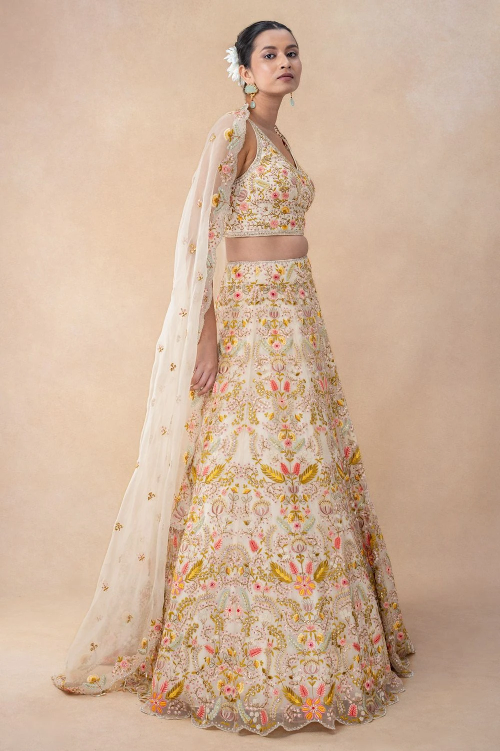 Experience the epitome of grace with this thread embellished lehenga set. Crafted in georgette, this set features a floral lehenga paired with a sleeveless blouse & a dupatta. Every detail exudes elegance, creating a timeless masterpiece.