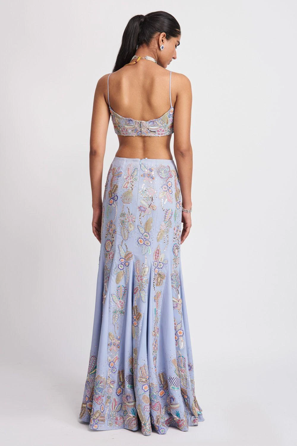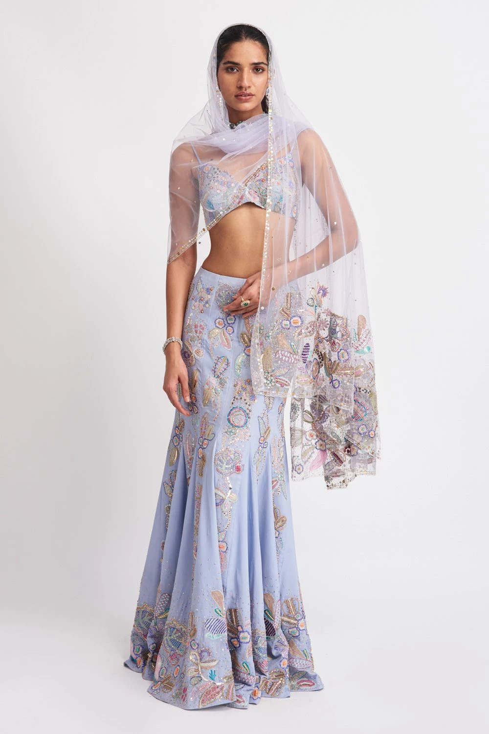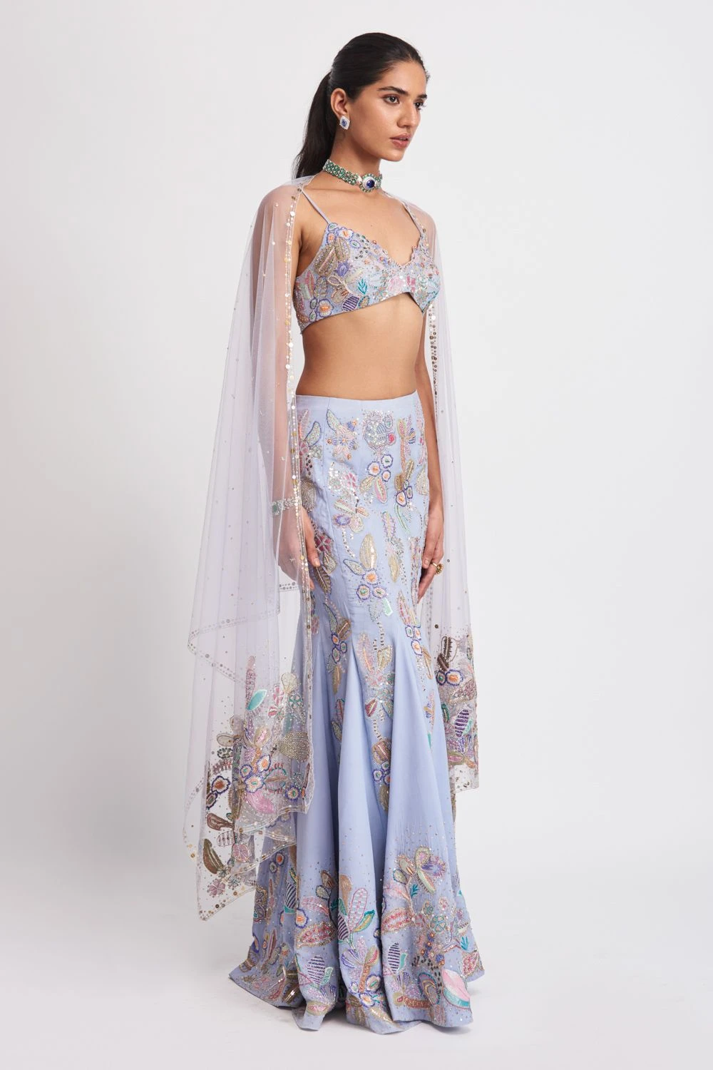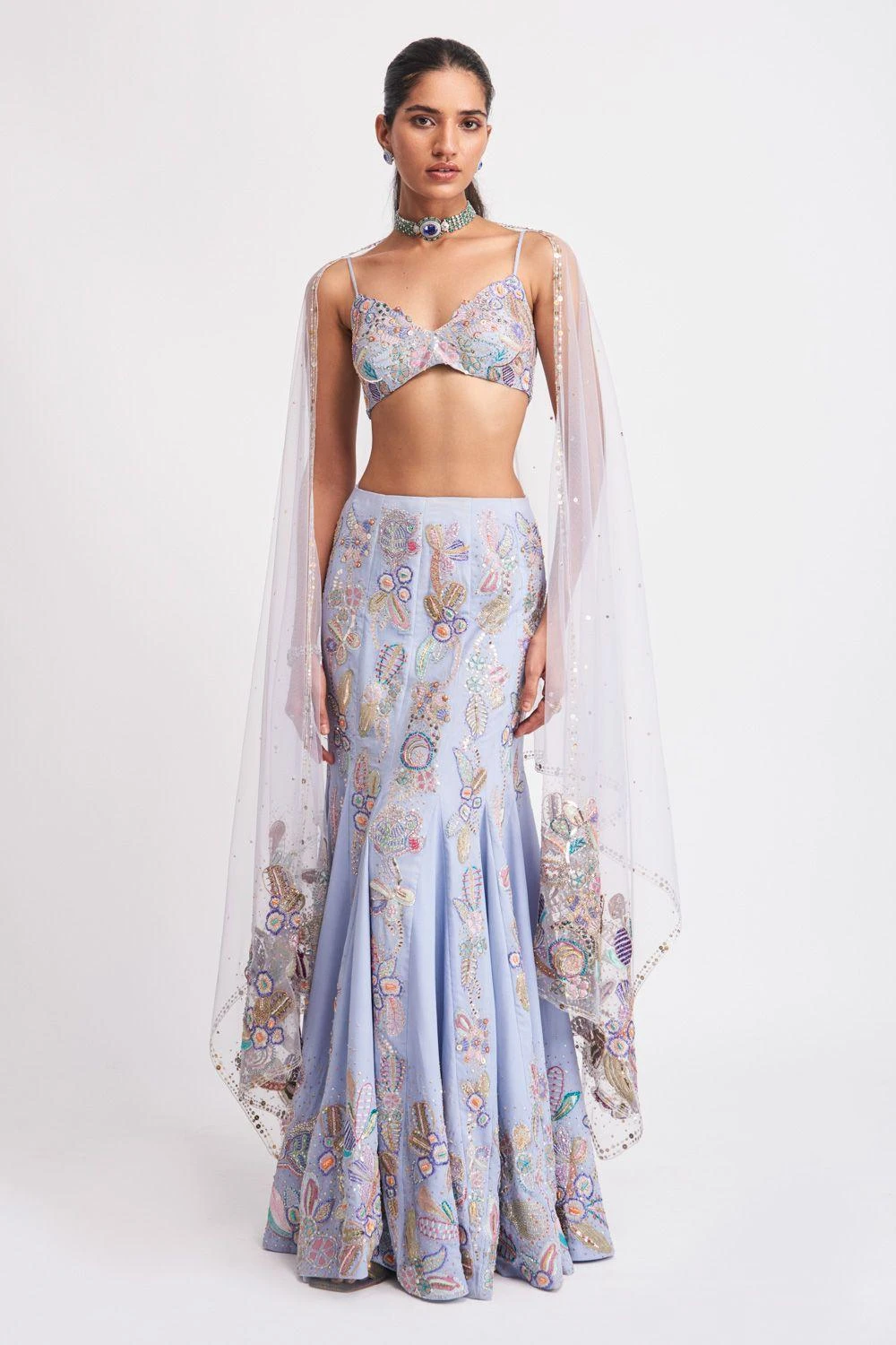 Enchant in opulence! The livid blue tulle mermaid lehenga skirt, adorned with floral appliquÒ, dances harmoniously with the bustier & dupatta. Elevate your elegance with this lavish ensemble.