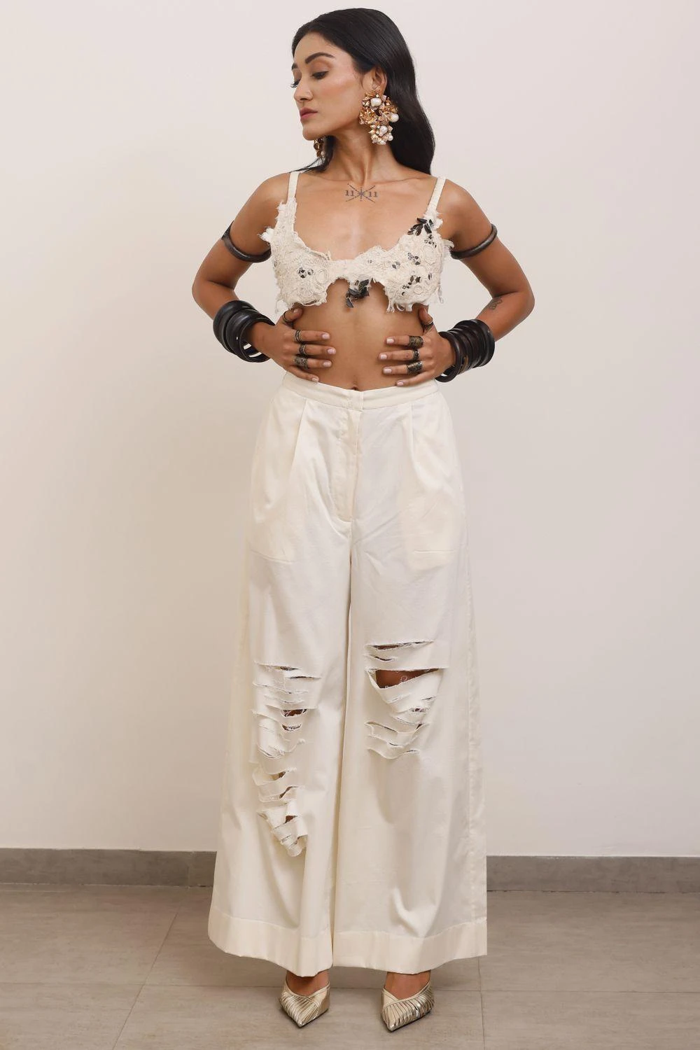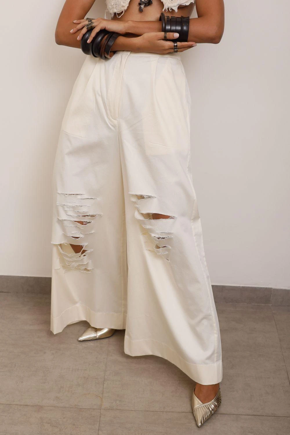 Experience the allure of these Pants with captivating deconstructed details. Meticulously crafted, these pants effortlessly blend comfort and creativity, making them a statement piece that adds a touch of modernity and individuality to your wardrobe.