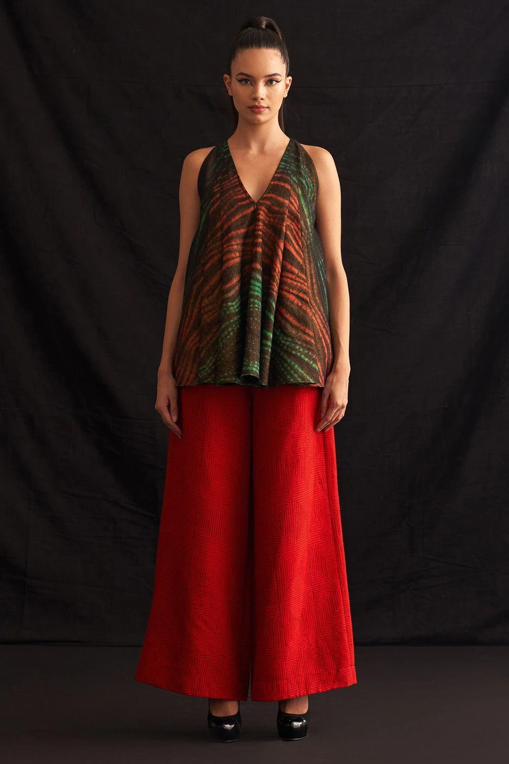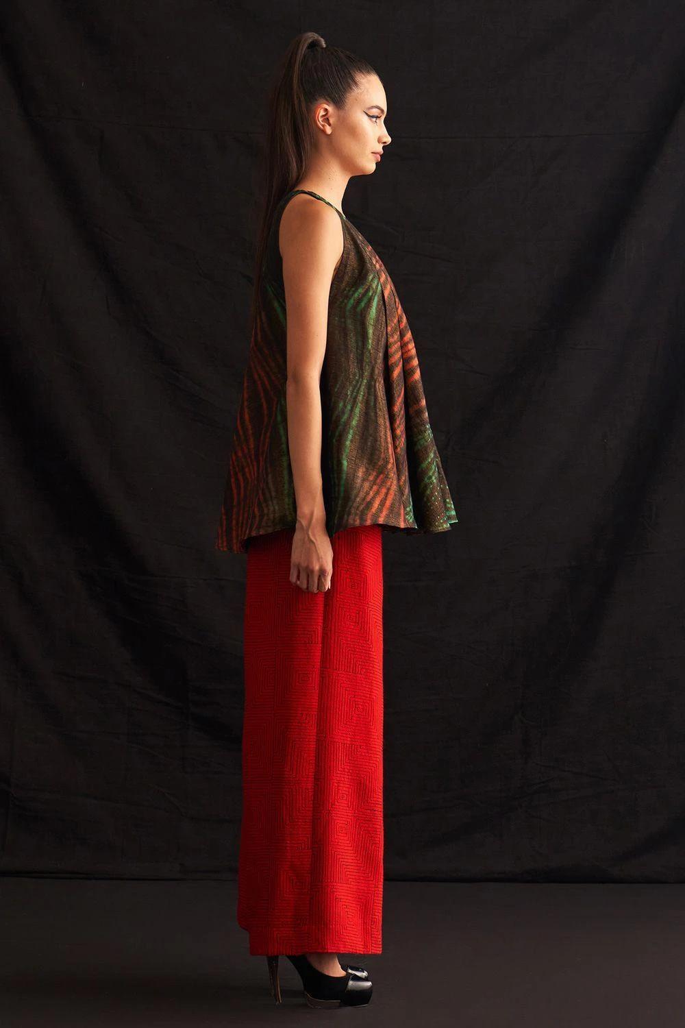 Embrace elegance in this red & green hand-woven cotton-zari swing shirt adorned with exquisite shibori patterns. Perfect for cultural festivities, its sleeveless design brings breezy comfort & artistic charm to any summer gathering or outdoor event.