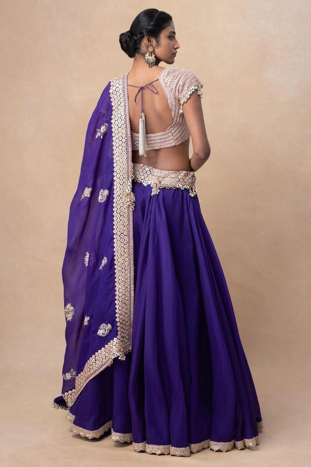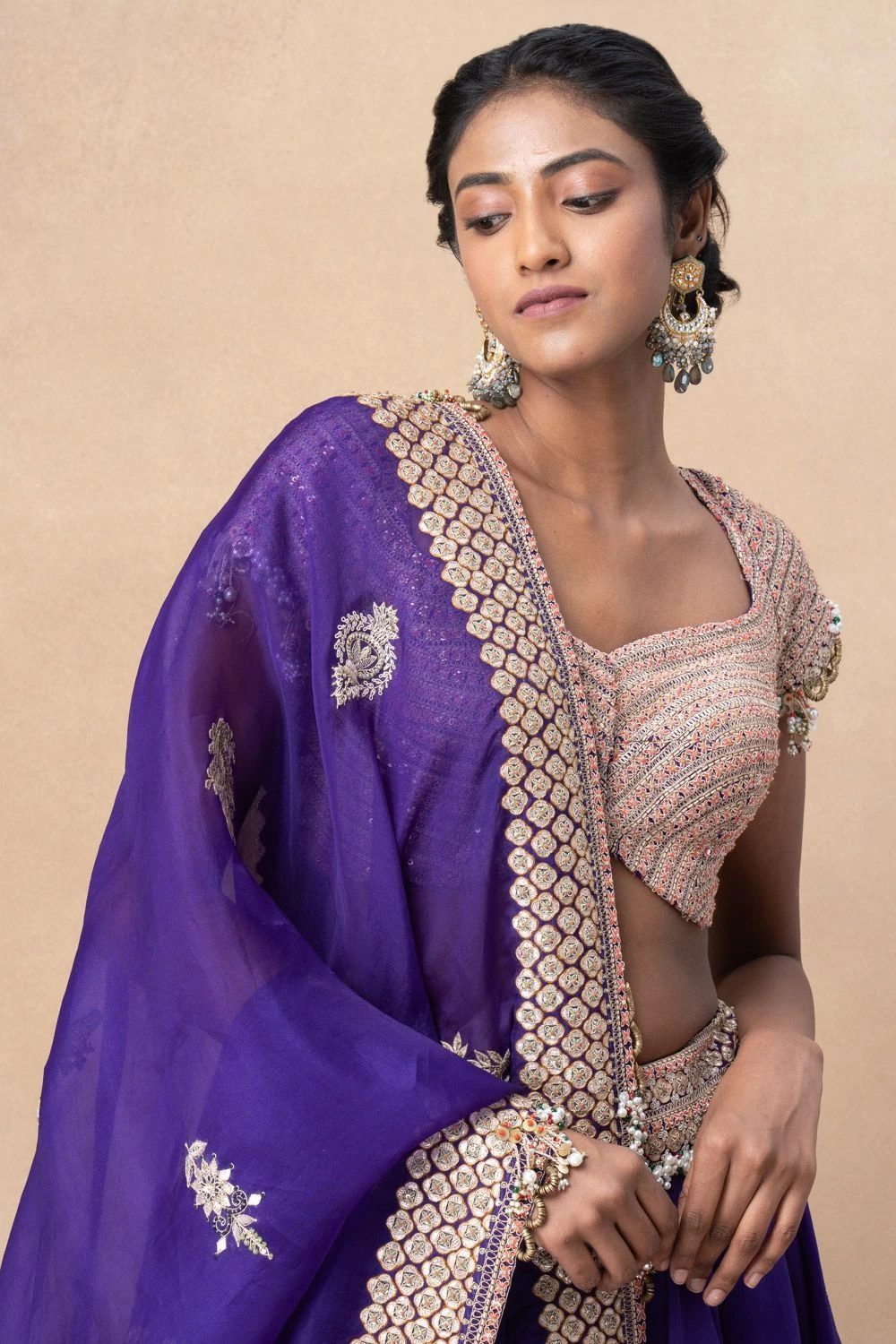 Make a statement as a bride in this stunning lehenga set. Crafted in silk, the intricate floral embroidery adds opulence to this outfit. This set includes a lehenga, an equally versatile blouse, and a dupatta.