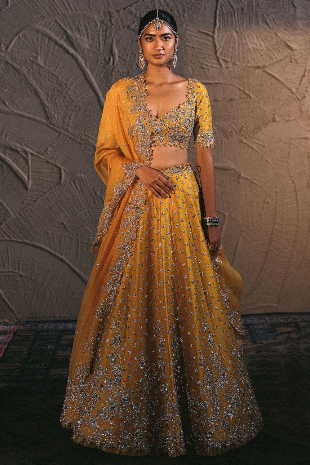 Spring weddings call for vibrant & flamboyant ensembles like this mustard yellow lehenga. It is made in a raw silk base and adorned with creeper, chitta & zardosi cutwork all over. It comes with a matching blouse & organza dupatta.