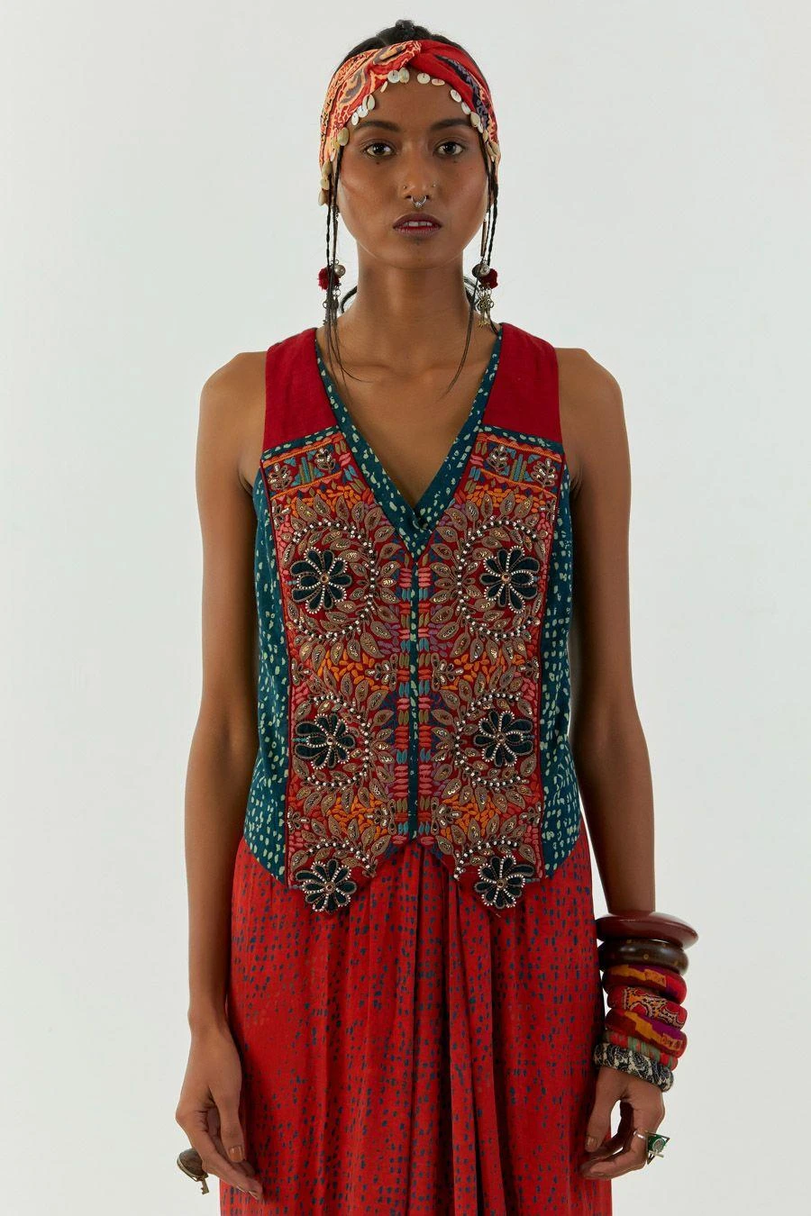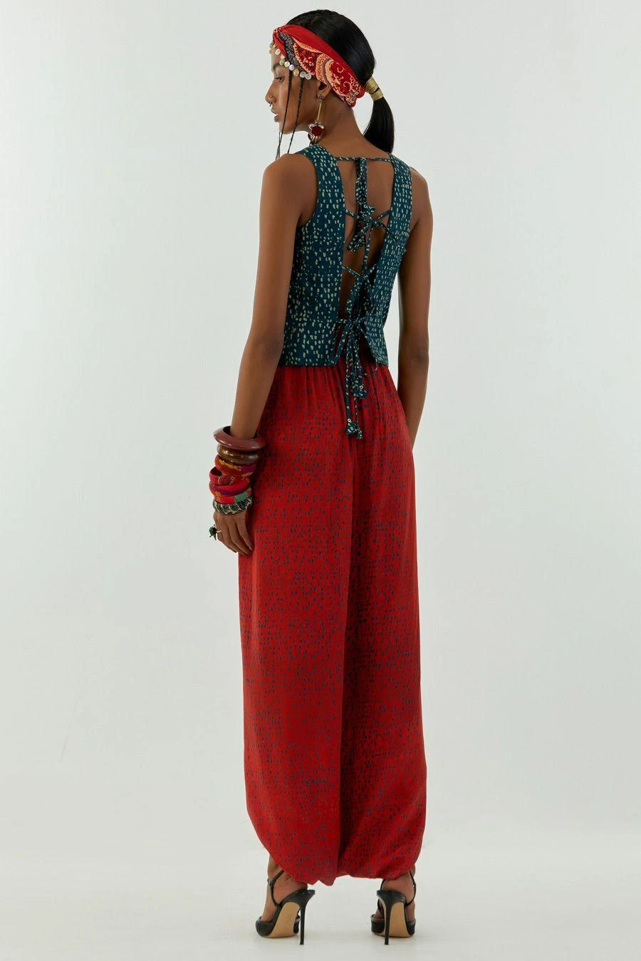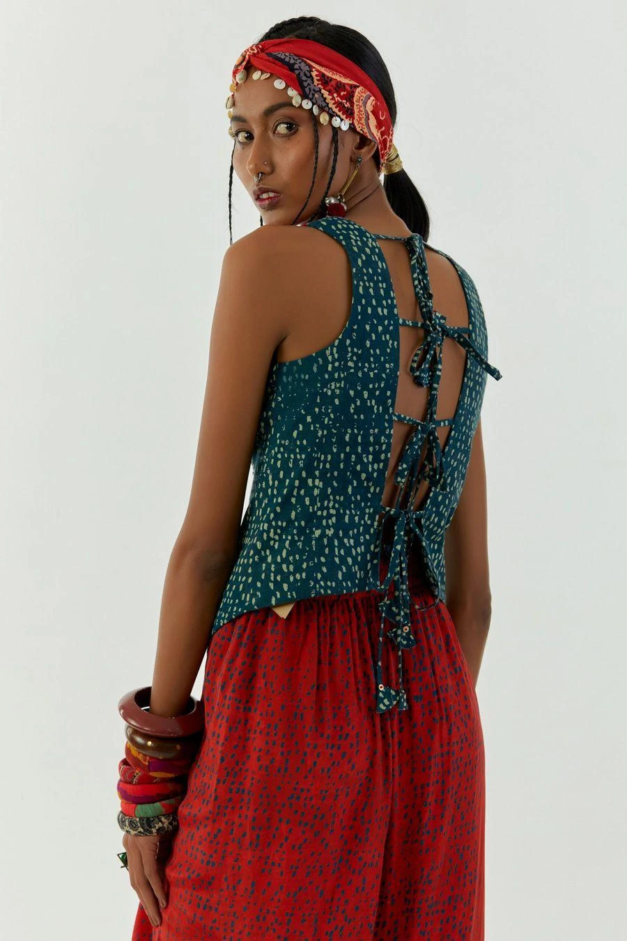 Maximise the life of your wardrobe with this exquisite corset blouse. Crafted in mul mul, this textured printed Bhumi corset blouse features zari, resham & marodi embroidered details and tie ups at back.