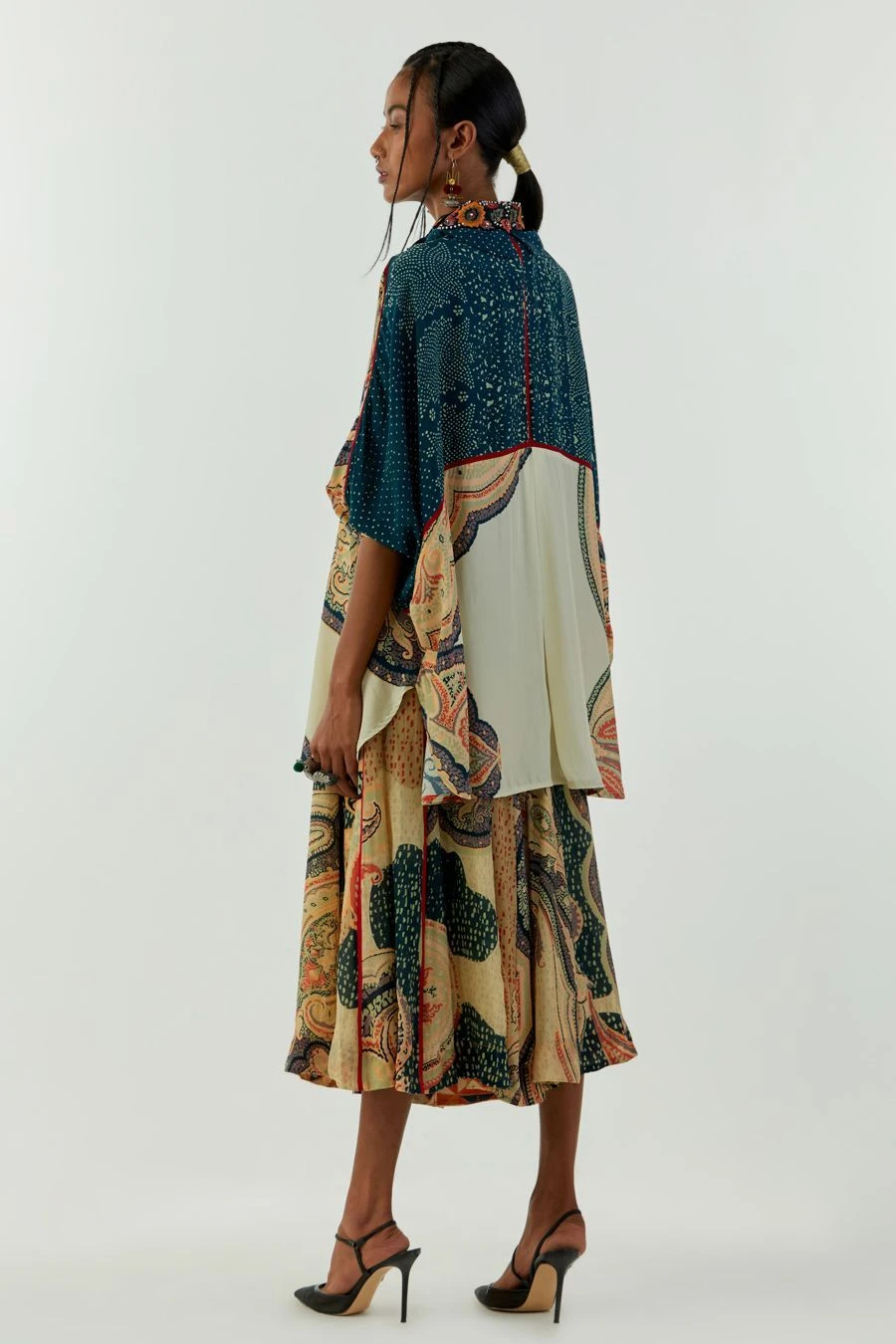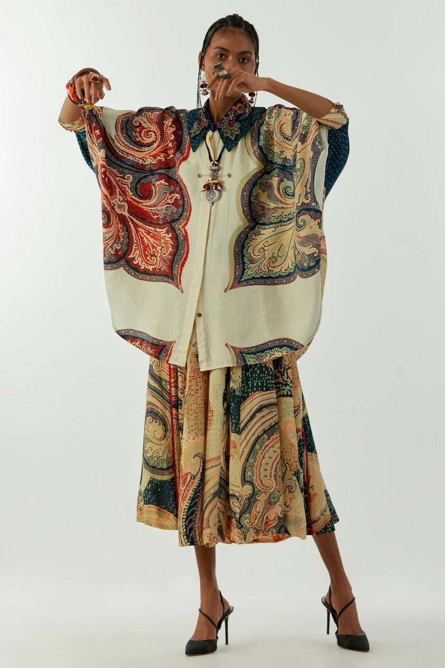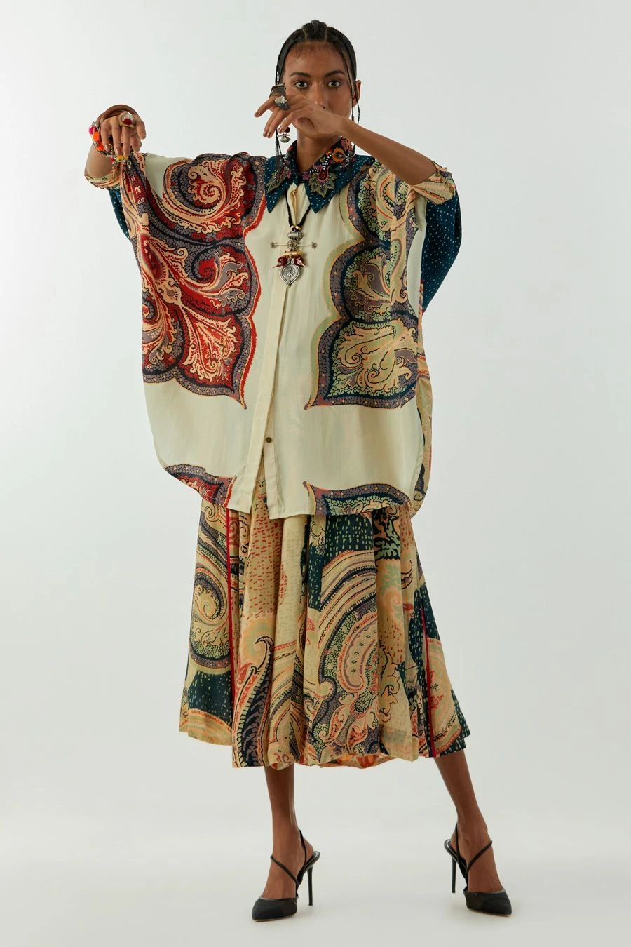Maximise the life of your wardrobe with this exquisite shirt. Crafted in natural crepe, this ambi printed mandala shirt features an embellished collar. Pair it with coordinating trousers from the collection to complete the set.