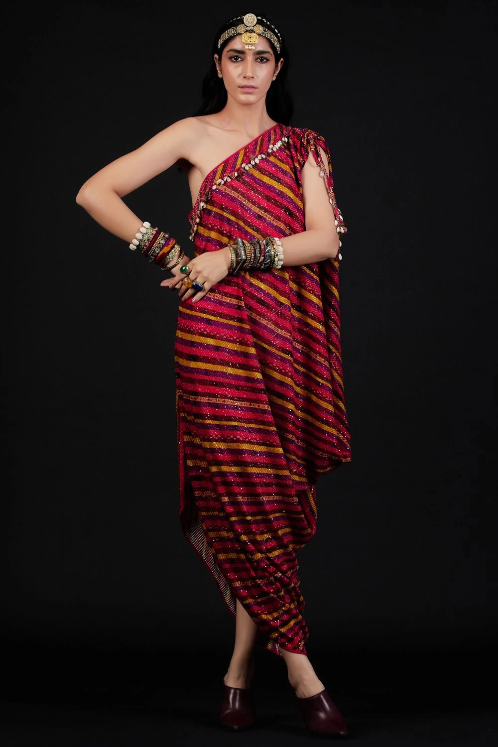 Elegant yet chic, this one shoulder rasa drape dress is a great pick for an intimate festivity. It is made in a shimmery natural crepe fabric and accented with cowry shell & tassels. Add a stack of statement cuffs and clutch to this look.