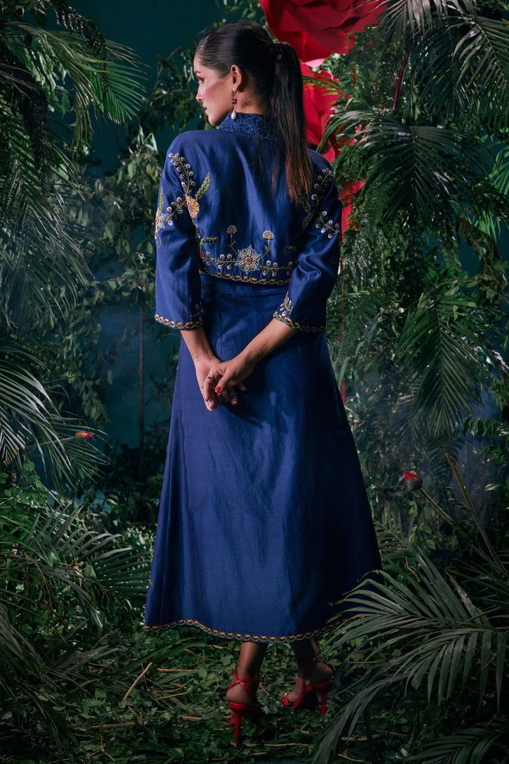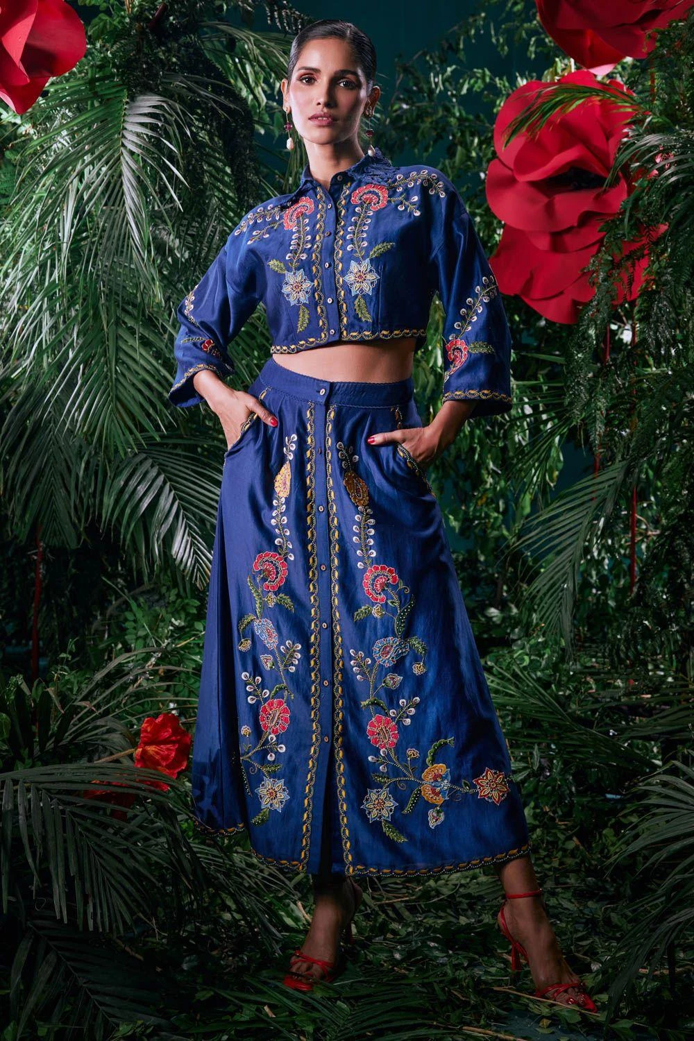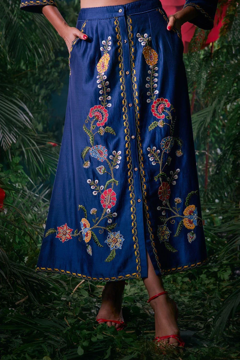 Radiate sophistication with this Indigo Chanderi skirt, beautifully adorned with exquisite floral applique, intricate threadwork, and delicate beadwork. This ensemble epitomizes the perfect fusion of modern craftsmanship and timeless elegance.