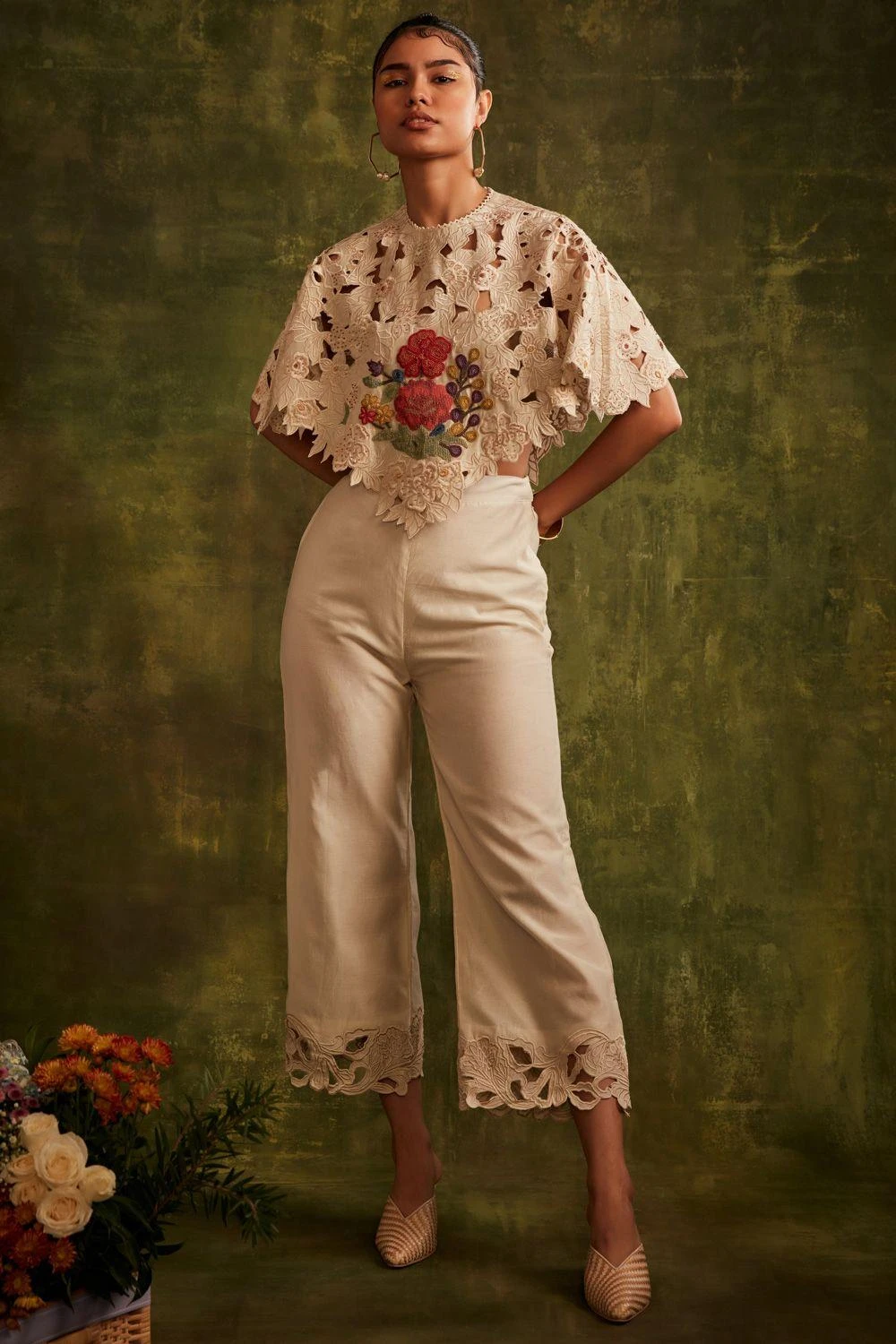 This stylish ivory cutwork poncho is adorned with floral beadwork details. This chic piece can be styled with flared trousers for daytime events.