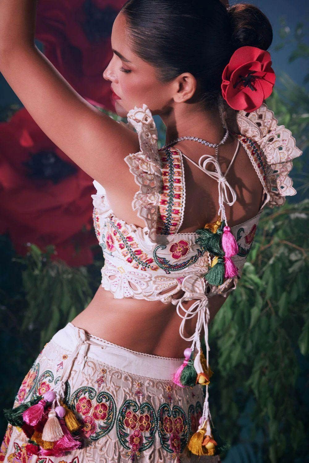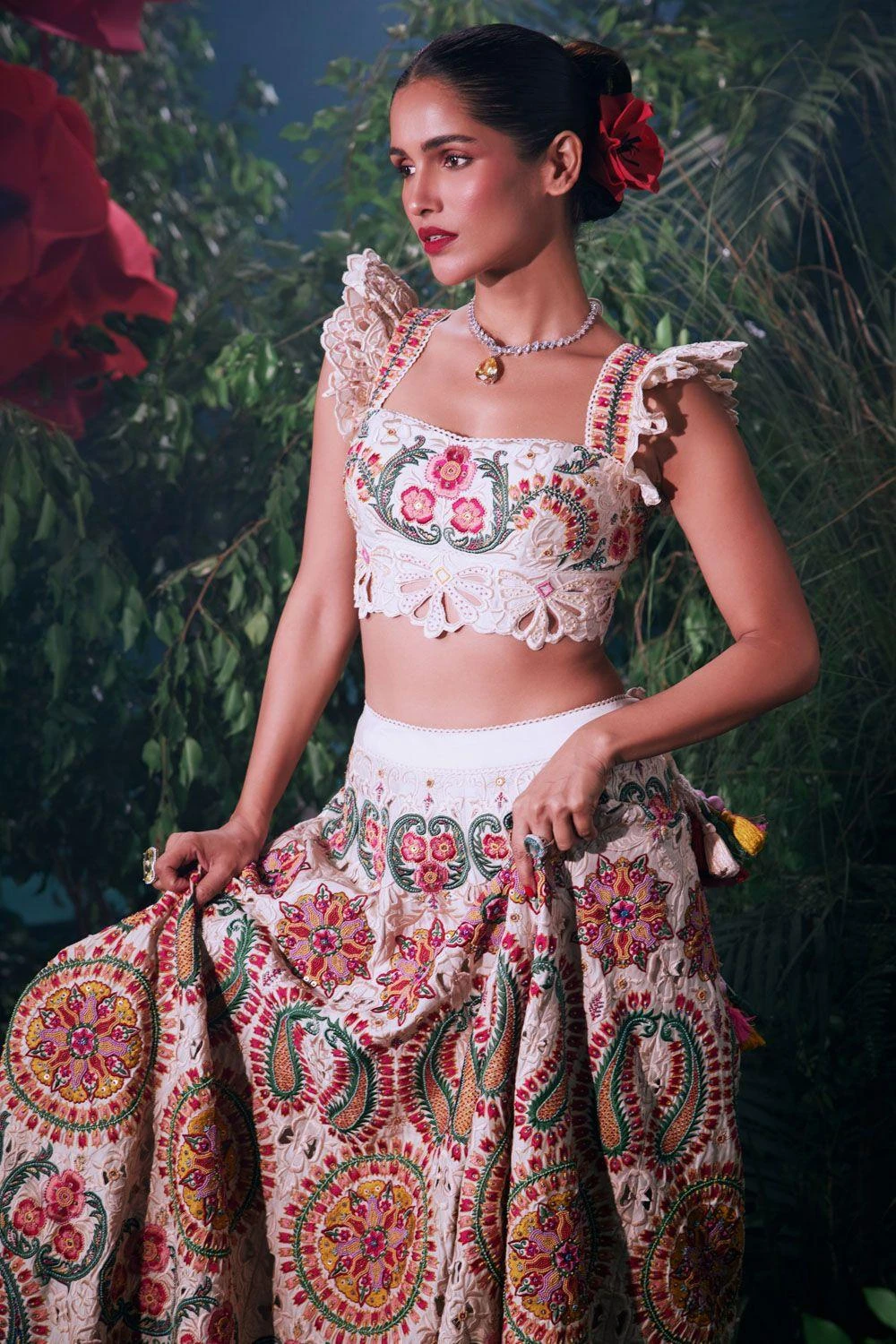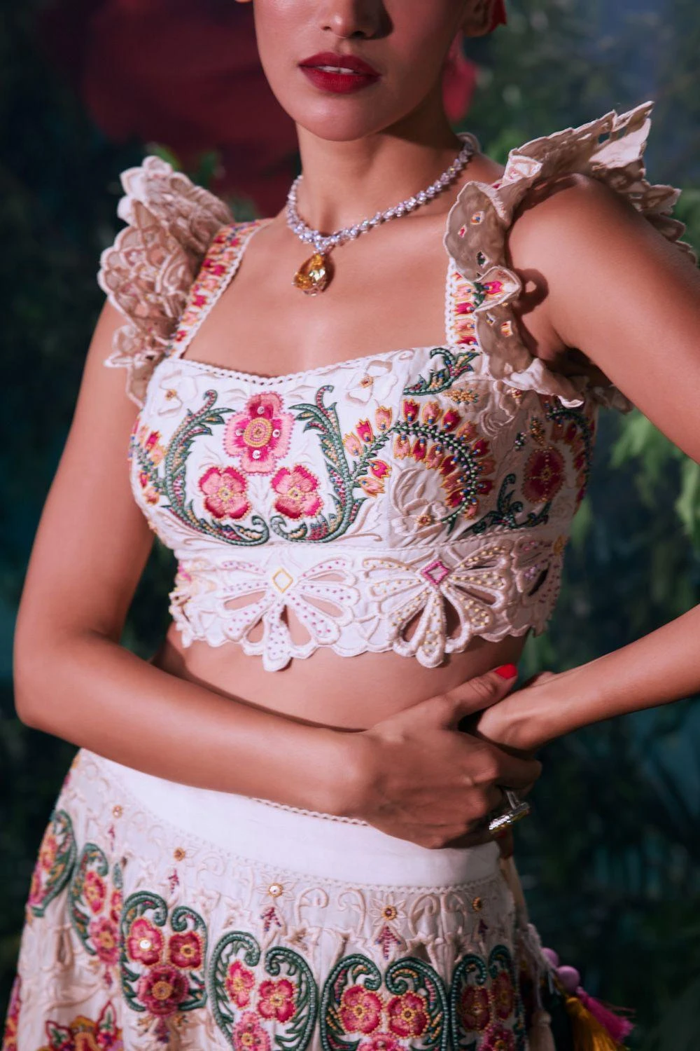 Elevate your elegance with this Ivory top, beautifully adorned with intricate threadwork and delicate beadwork. This ensemble is a harmonious blend of artistic craftsmanship and modern sophistication, redefining your unique look.