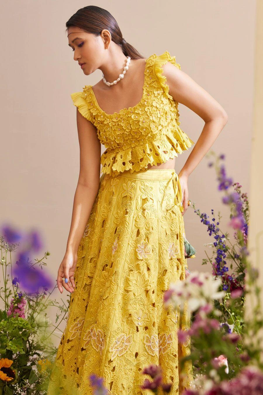 This yellow cutwork lehenga is perfect for daytime wedding festivities. Crafted in chanderi, this skirt features intricate beadwork & cutwork details. Style this one of a kind piece with the matching bustier for a chic & youthful look.