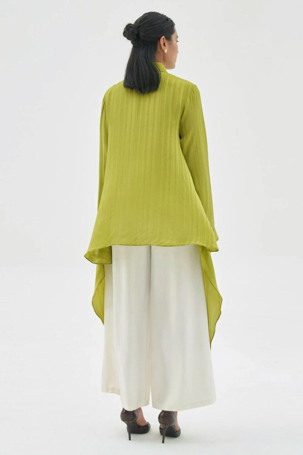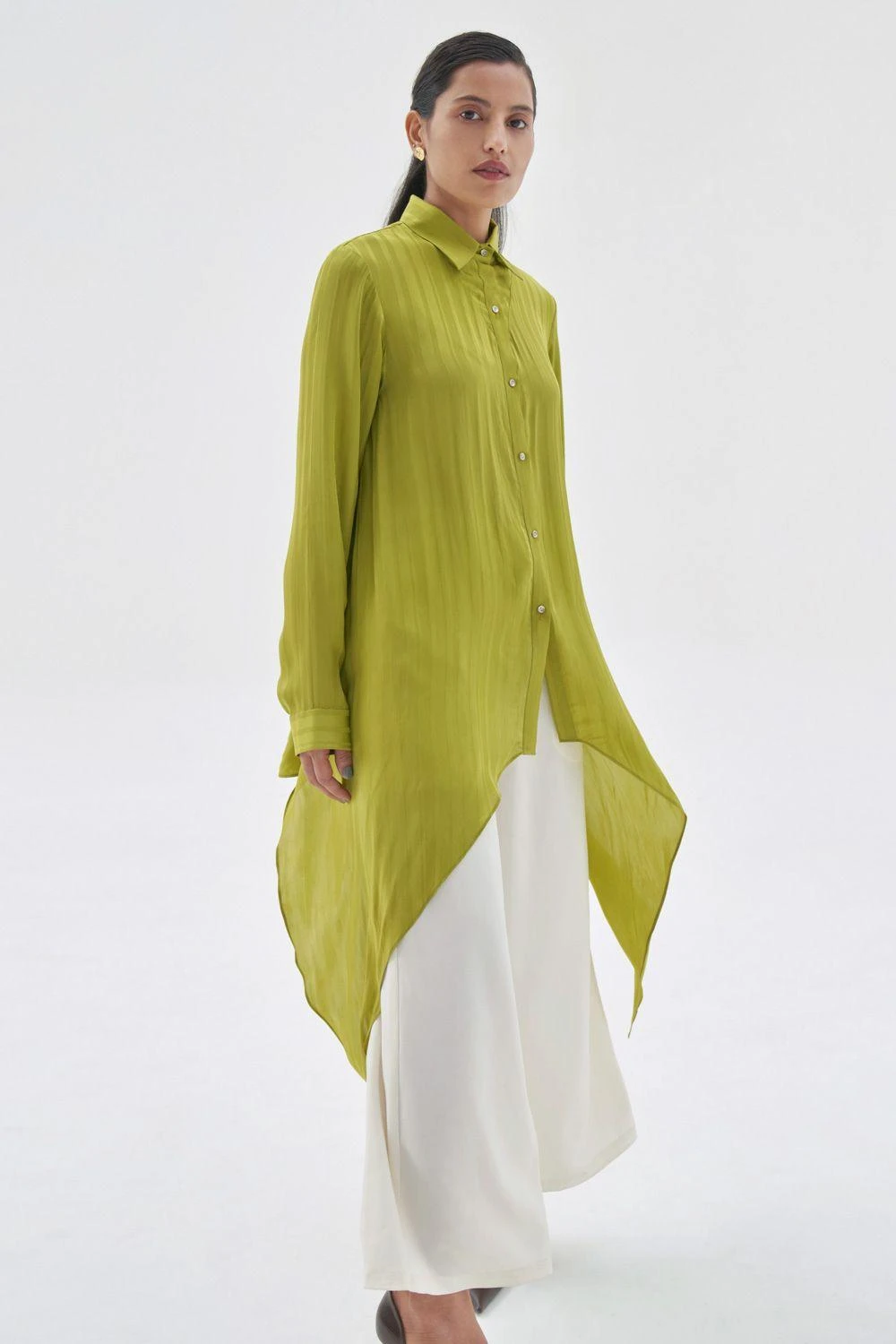 Long green shirt with silver button closures, this stylish shirt can be styled with both fitted or flared pants for a chic daytime look. It has tapered edges in the front, cut in air-weight self striped fabric.