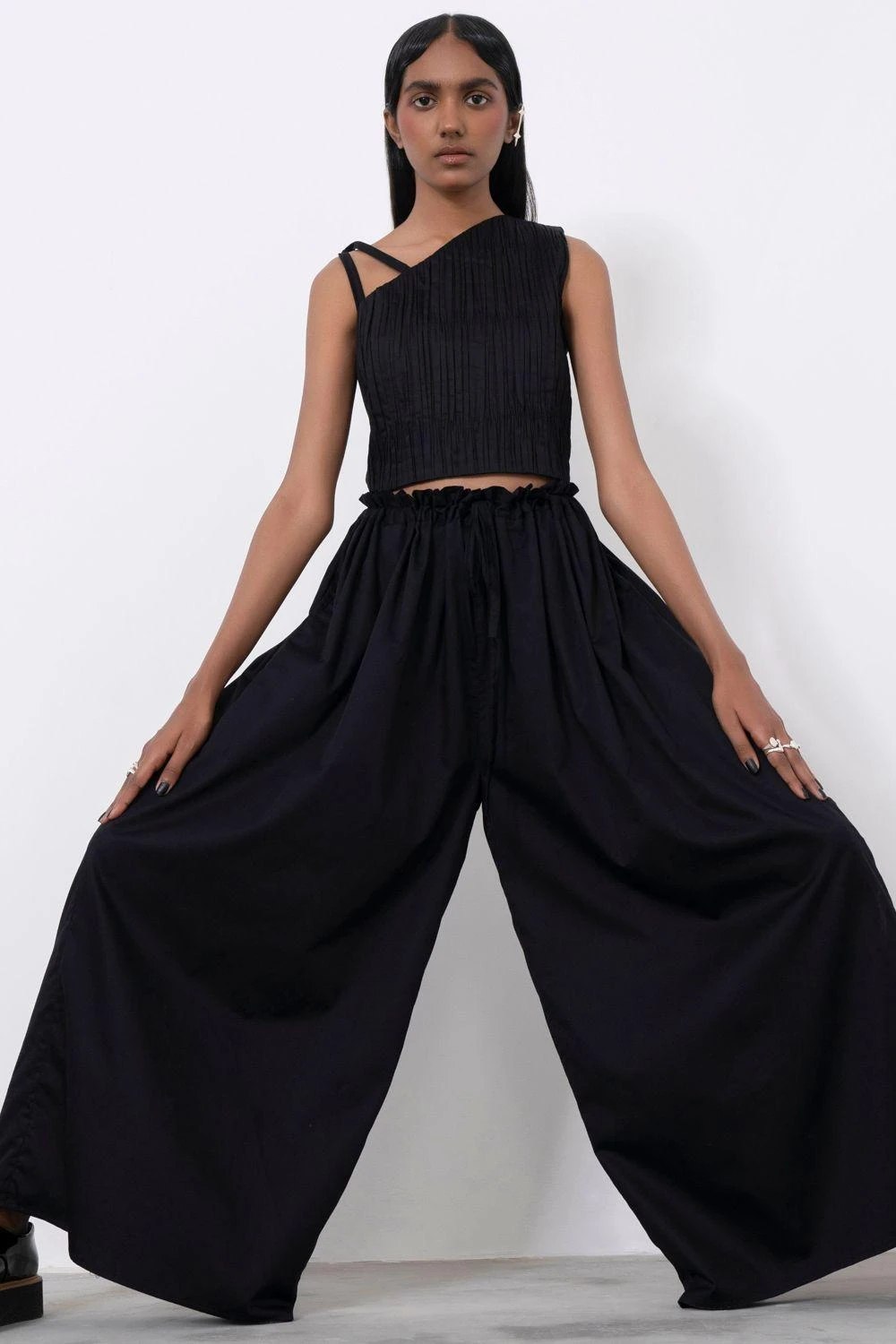 For an easy glam look, this black cropped top is a great choice. It is cut in 100% cotton with a ruched effect at the front. It features an asymmetric shoulder line and an easy side zip closure.