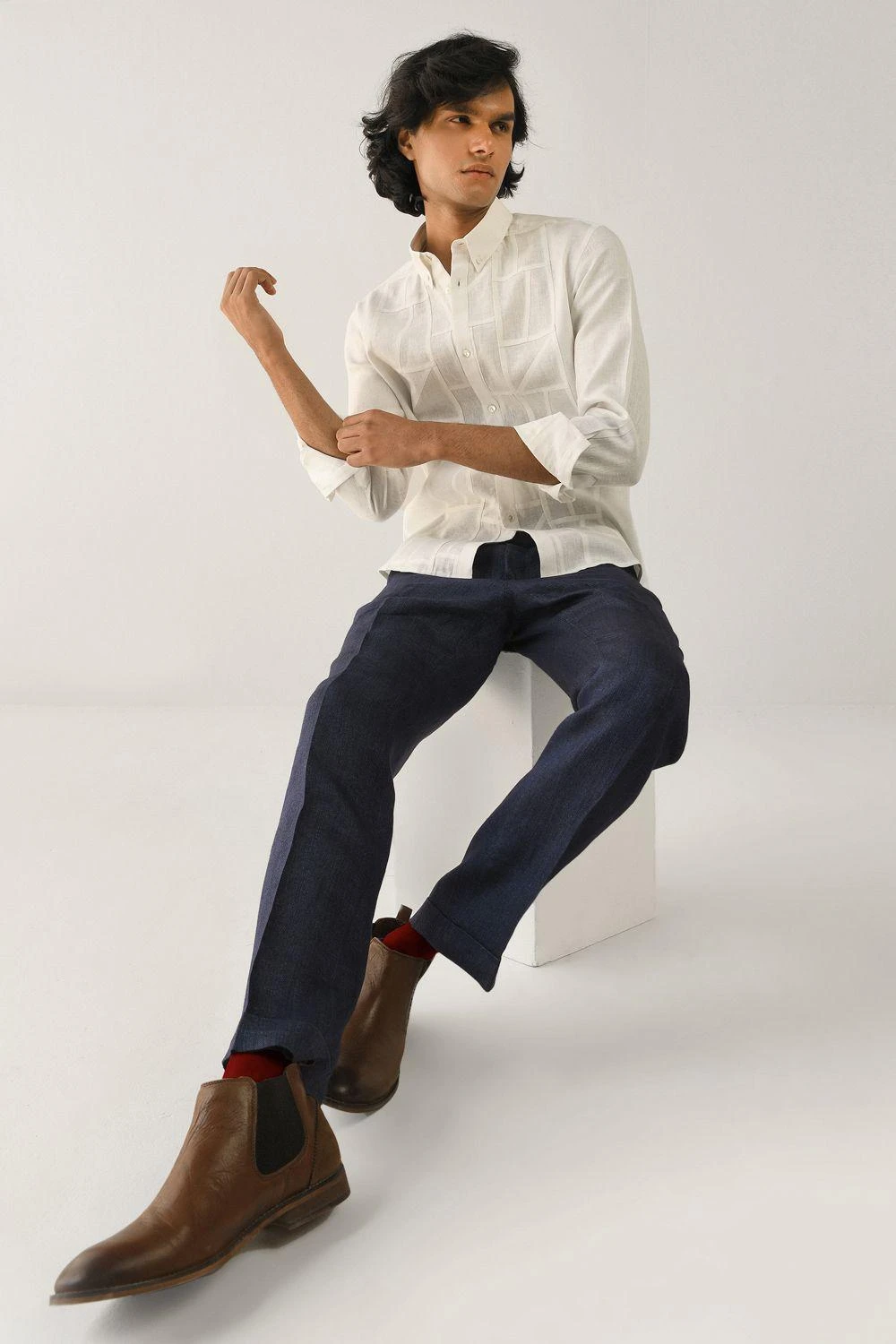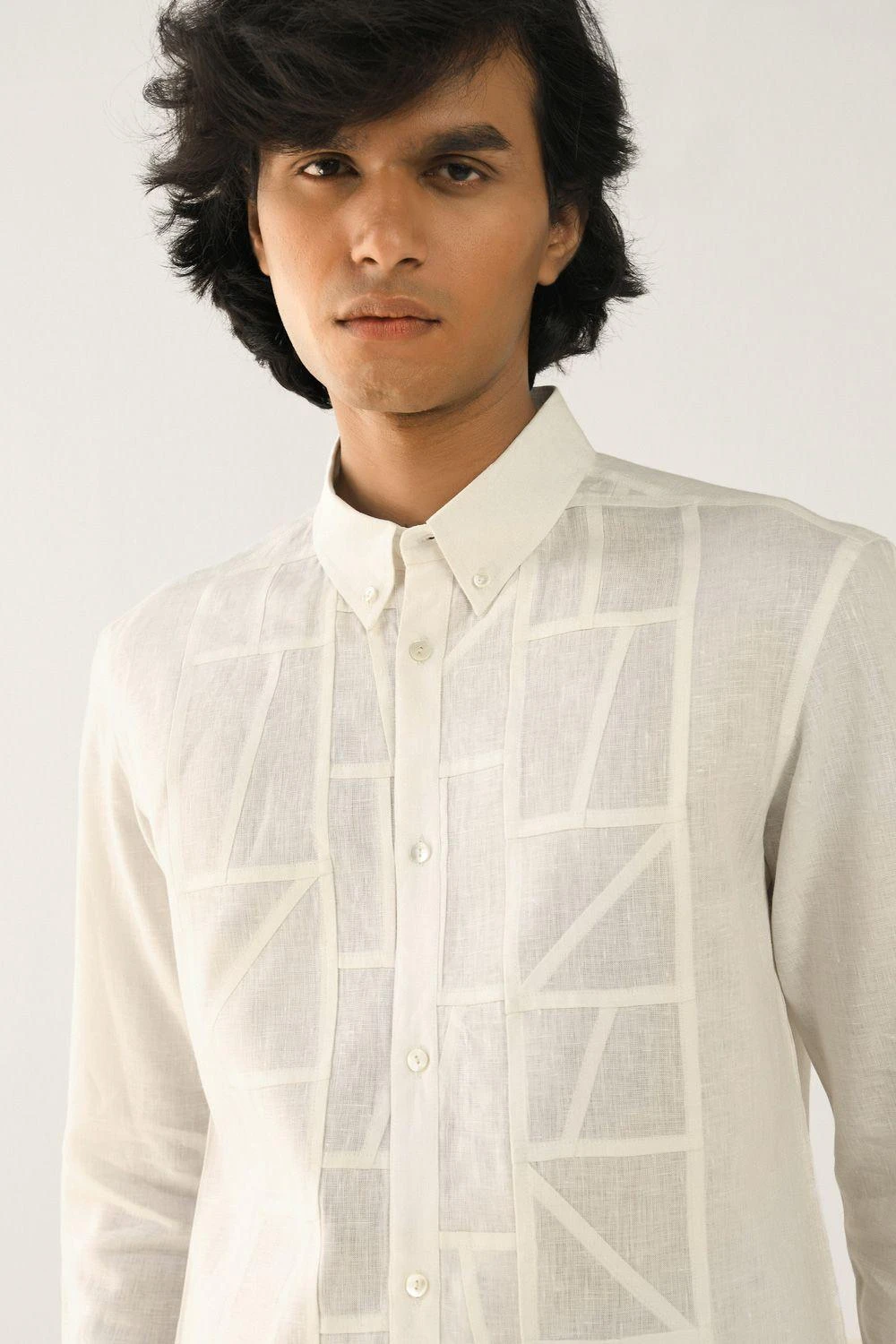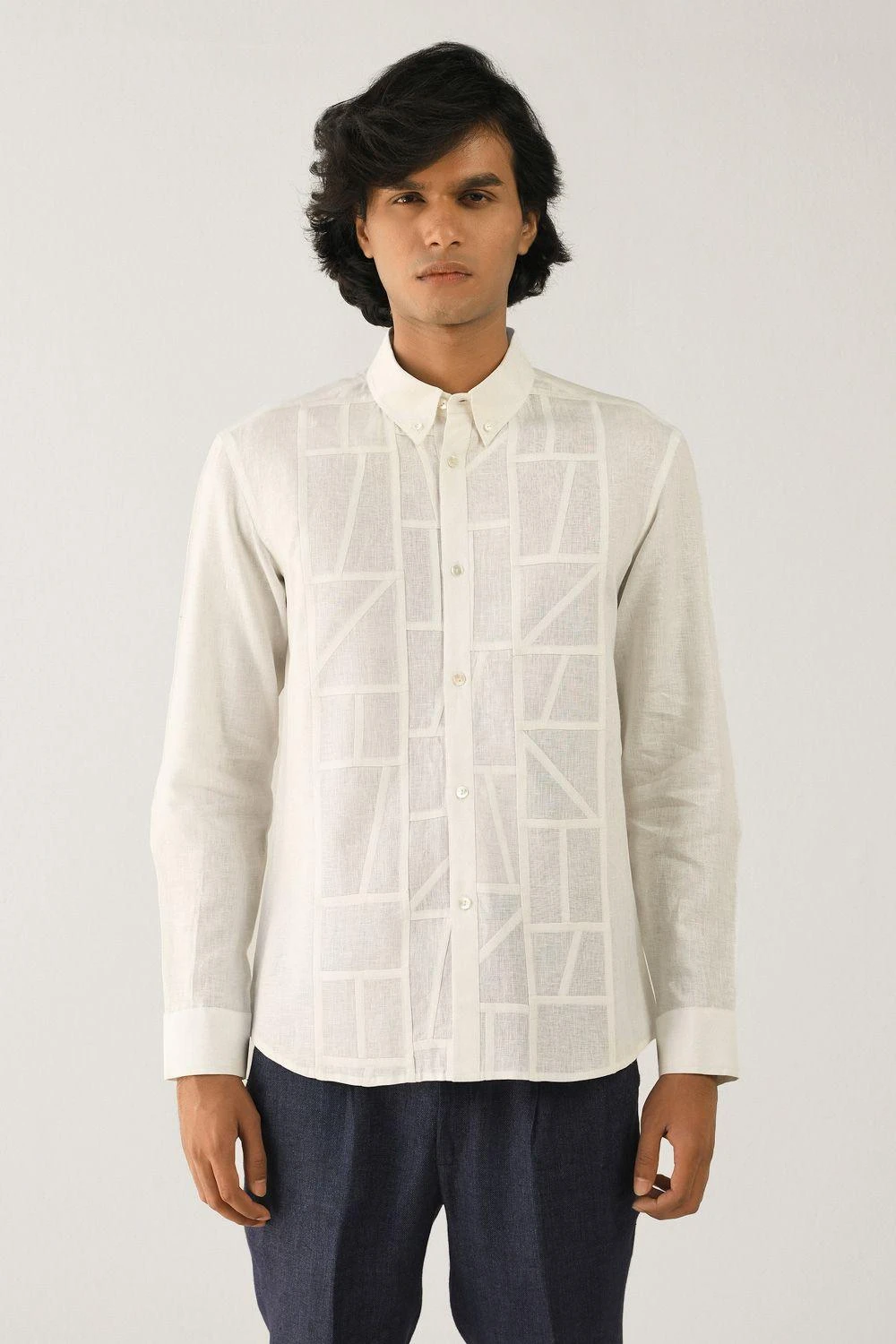 Take your contemporary style a notch higher with this ivory abstract shirt. It is woven in airy linen fabric and enhanced with stitch detailing in abstract arrangement. Style this piece with a pair of washed denims and sneakers.