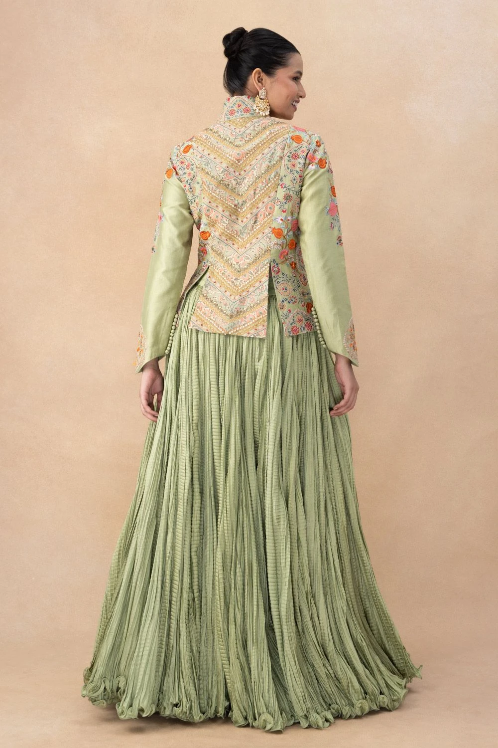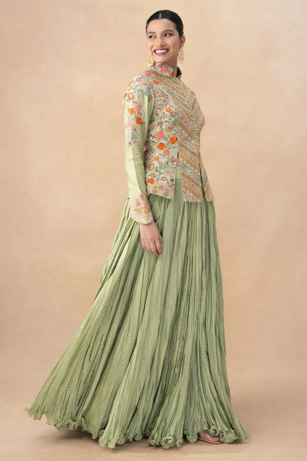 The perfect amalgamation of style & comfort, this lehenga set works across occasions. Crafted in chanderi, this set features a floral embellished boho jacket with a skirt. Add a pair of statement earrings to complete the look.
