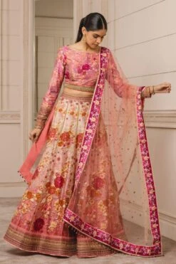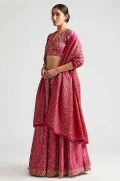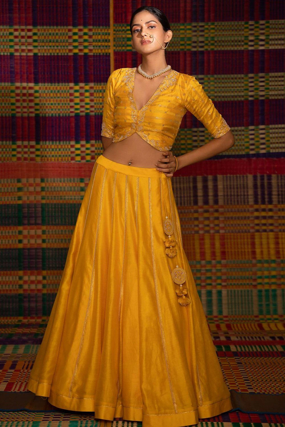 For your upcoming festive season, this classic & elegant yellow lehenga set is a great pick. It features a scallop kali lehenga adorned with intricate hand embroidery, paired with a striped V neck blouse & mandala hand embroidered organza dupatta.