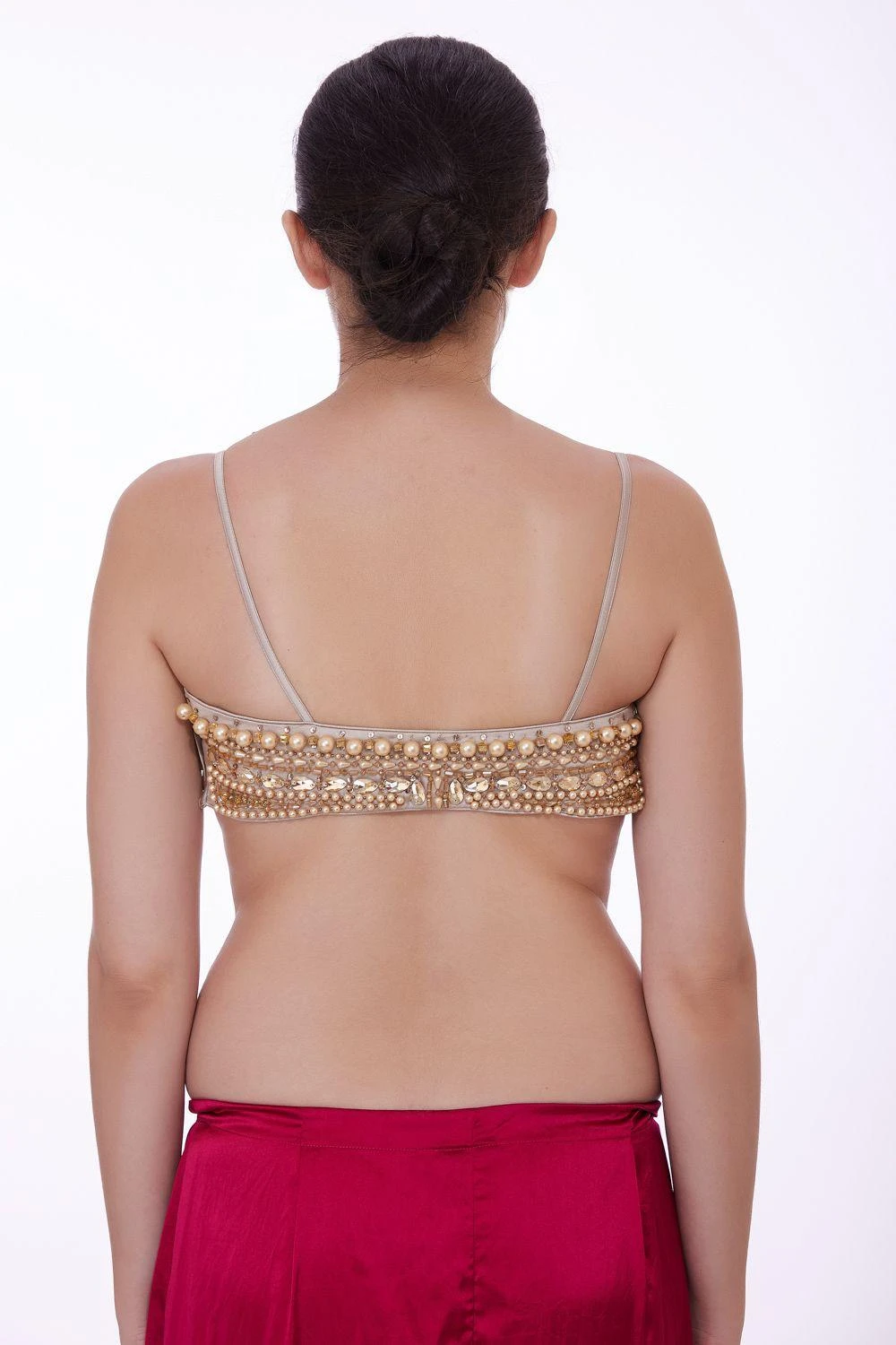 Elevate elegance in the ashen grey diamond & pearl-adorned blouse, a masterpiece in net & polyester satin. Perfect for upscale affairs, where each exquisite detail tells a story of refined sophistication. Embody timeless grace.