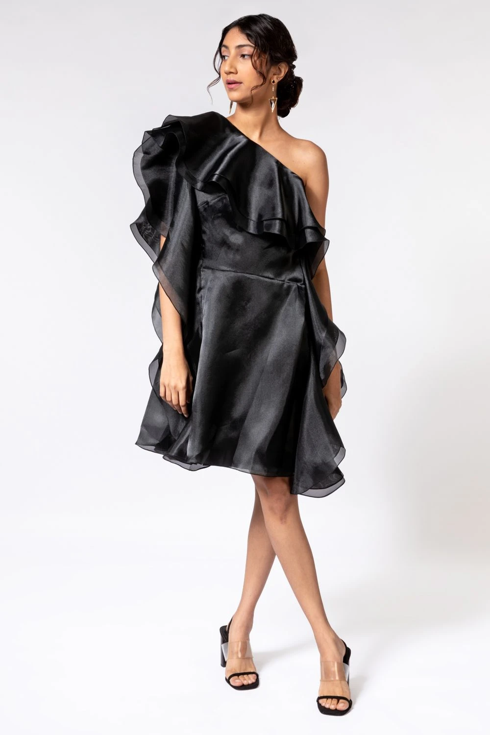 Make heads turn at your next evening soiree in this black one shoulder dress. It is beautifully made in organza with elegant ruffle details. Style it with a pair of diamond studs to top off your look.