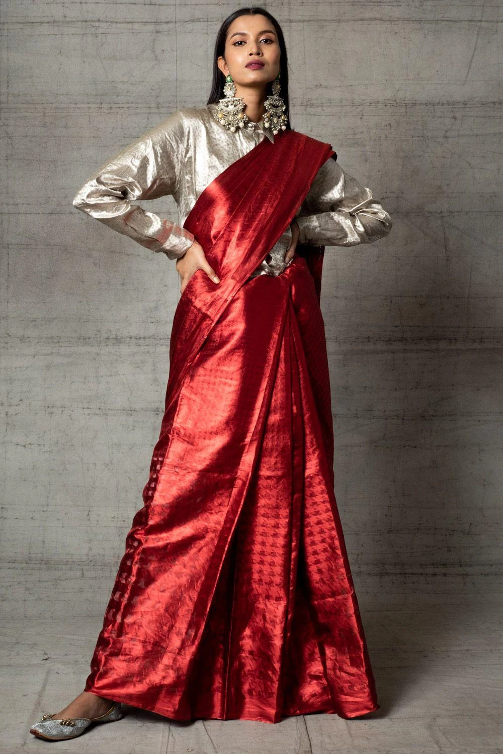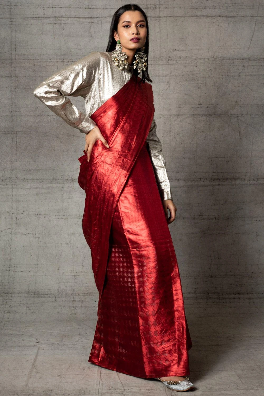 This silver shirt is a classic piece that can be styled for both Indian & contemporary looks. You can dress it up with a sari or lehenga or team it up with tailored pants for a formal look.