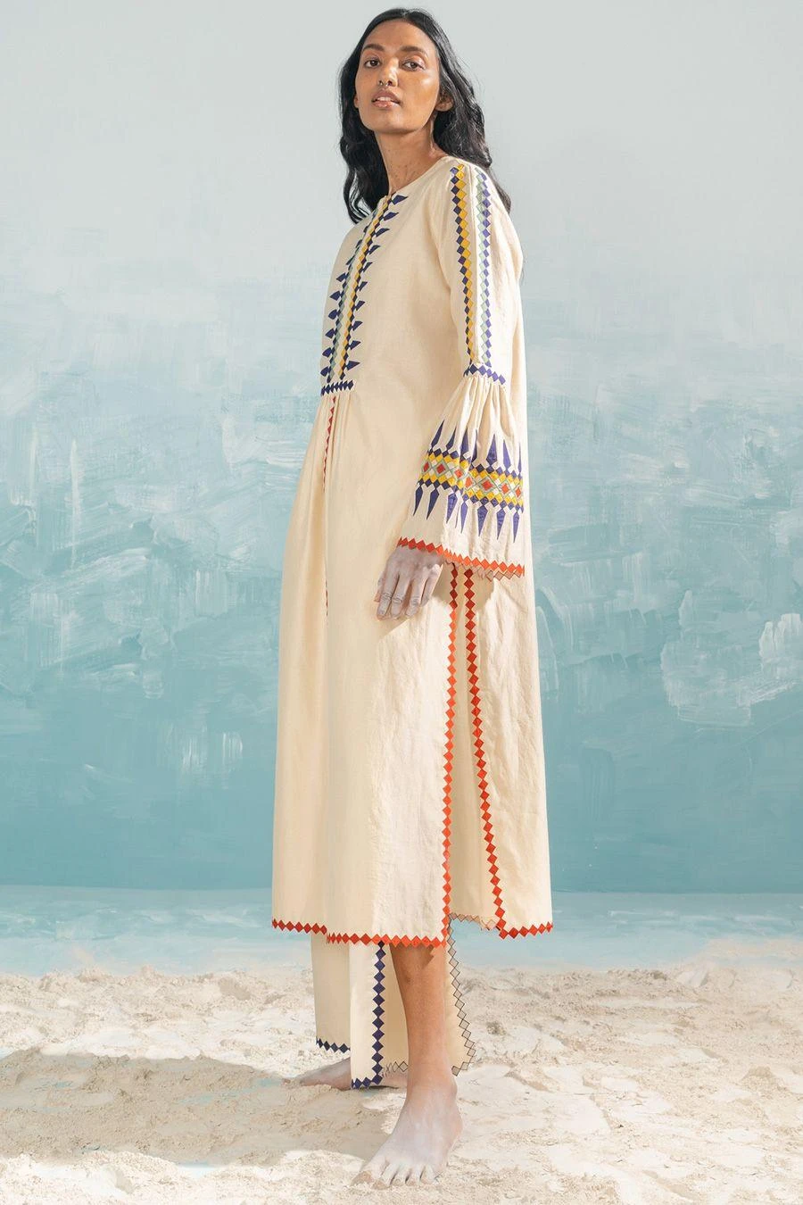 These beige high slit cutwork pants fall in the realm of luxe minimalism. Crafted in cotton satin, these pants feature hand cut applique & cutwork details. Style them with the Beige cutwork kurta from the collection to complete the set.