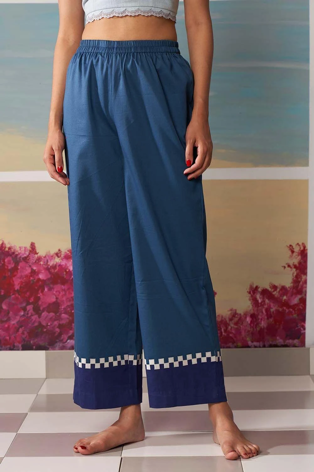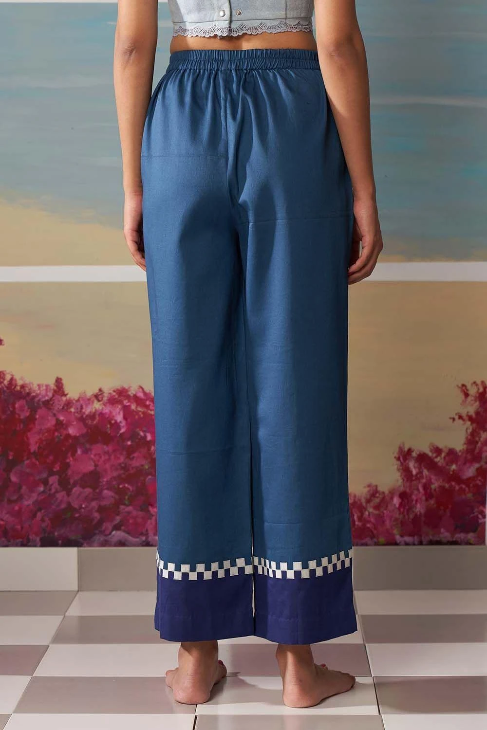 These straight blue pants have tribal artwork on the hem. Style this piece with a tunic or kurta to add an element of colour to the look.