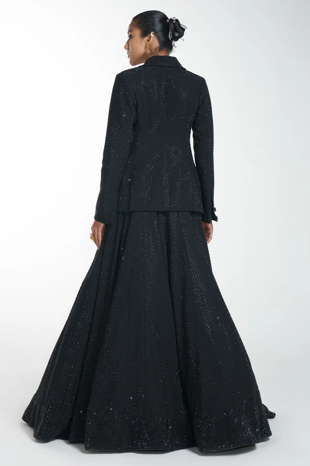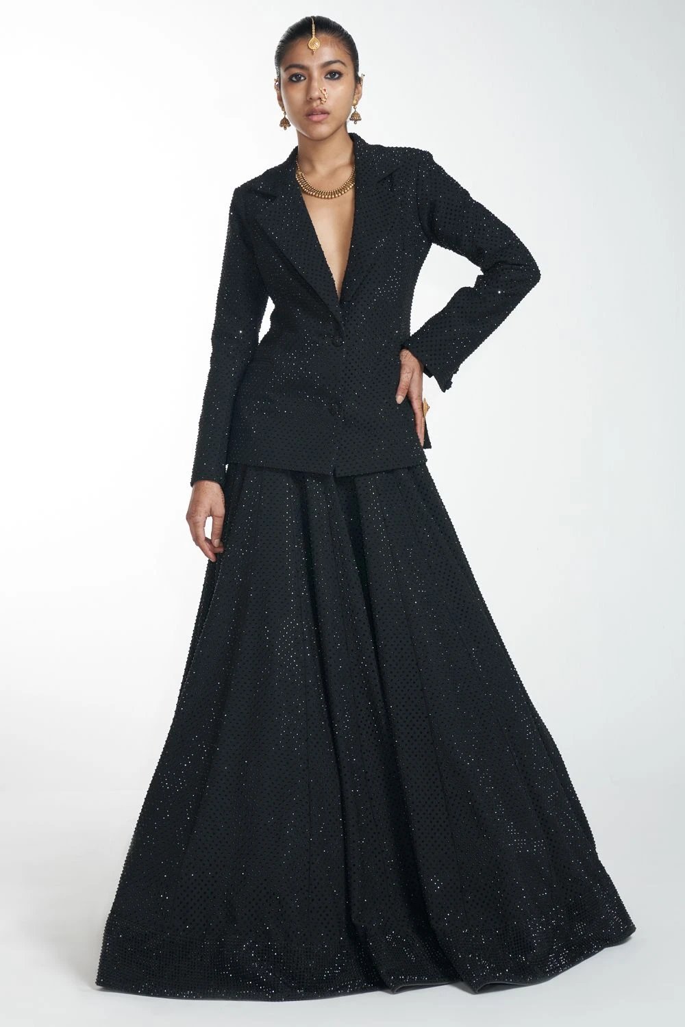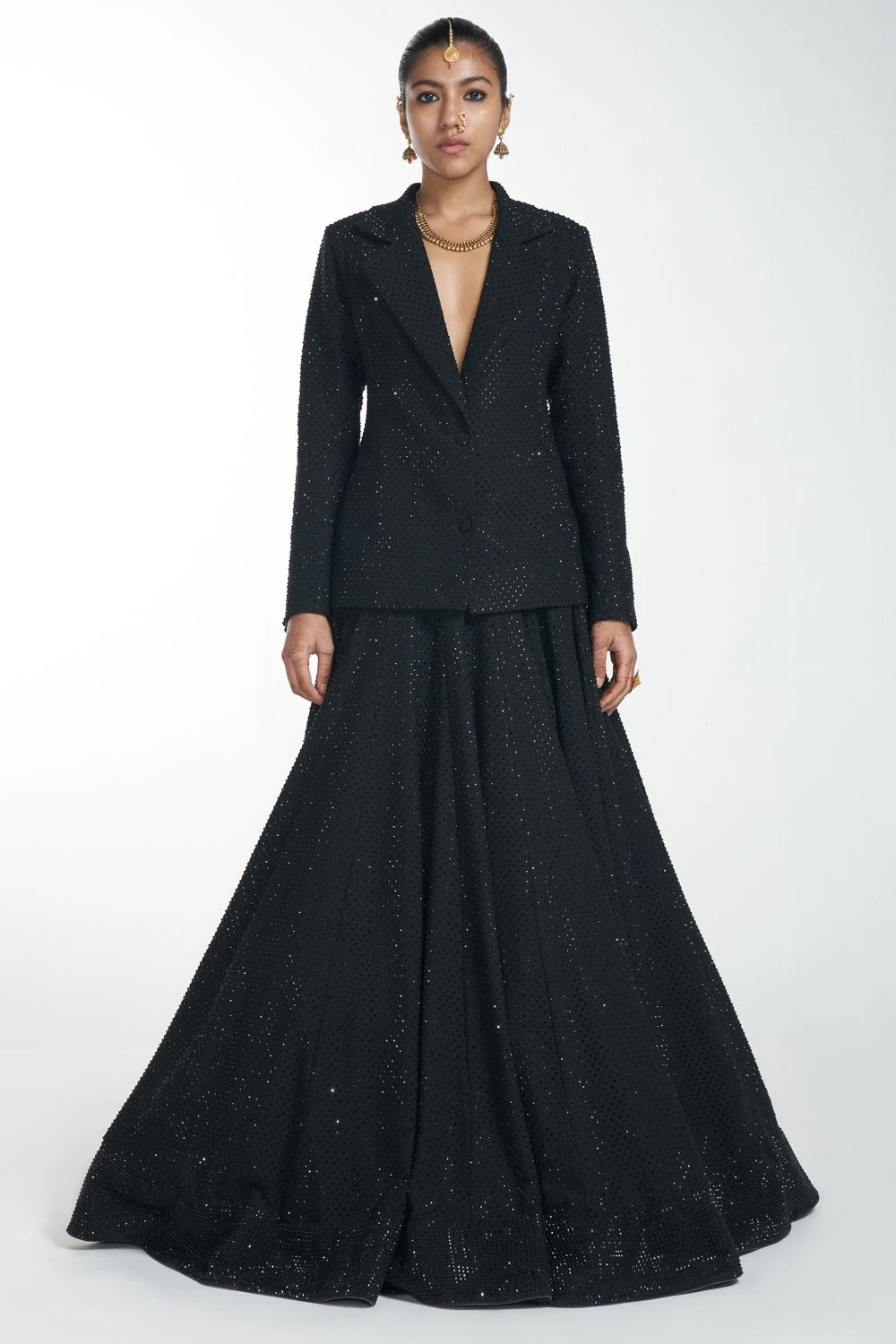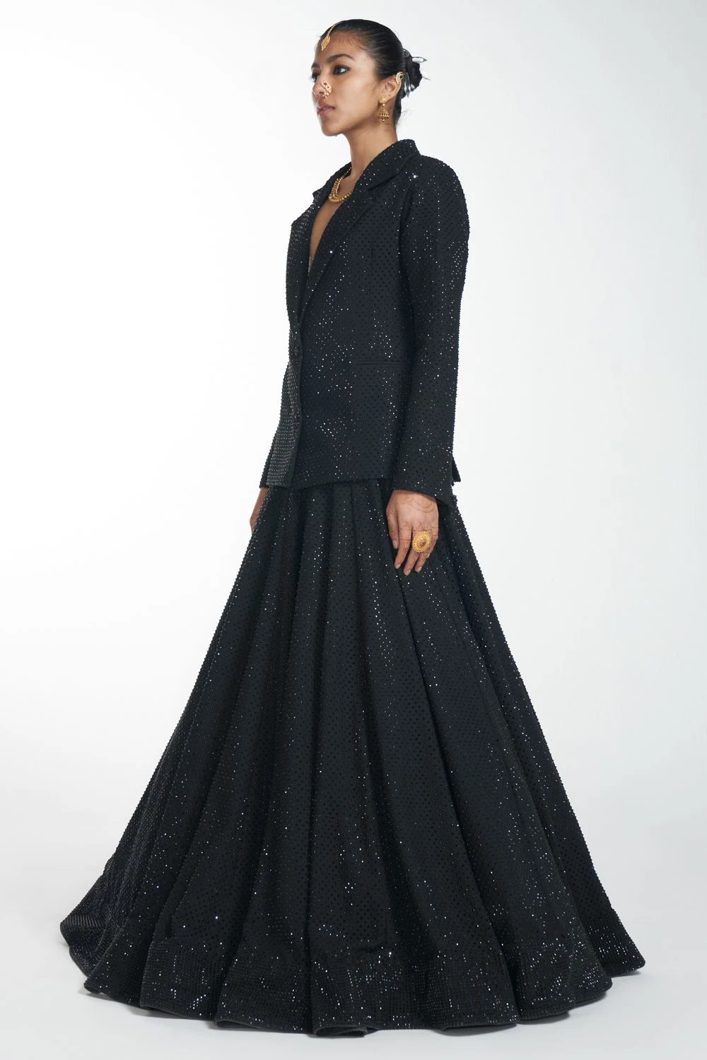 This breath-taking black lehenga set heralds the beginning of Indian wear for the new age women. Its luxe fabrication & edgy silhouette makes it perfect for a sangeet evening. The lehenga & blazer are fabricated in crystal embellished crepe.