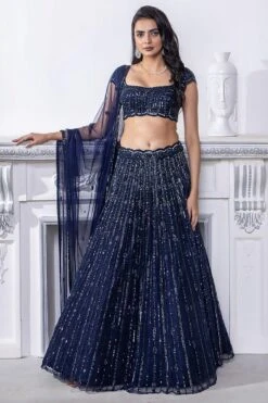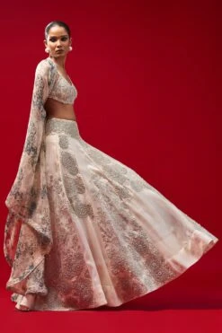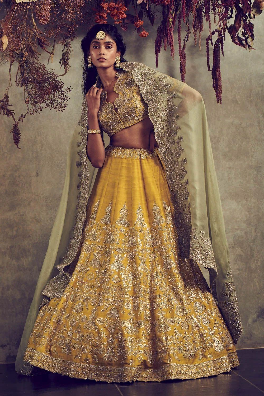 This ethereal mustard lehenga set is cut in raw silk & adorned with intricate zardozi embroidery, It comes with a light green sheer organza dupatta. This elegant piece is perfect for a daytime engagement or mehendi function.