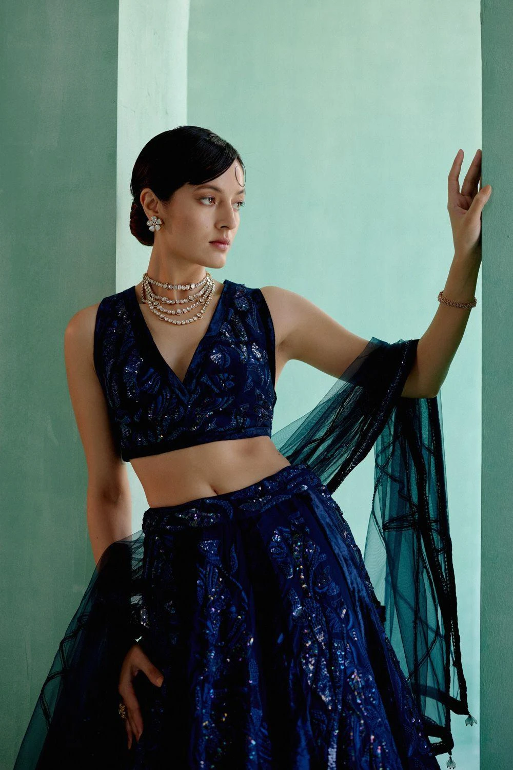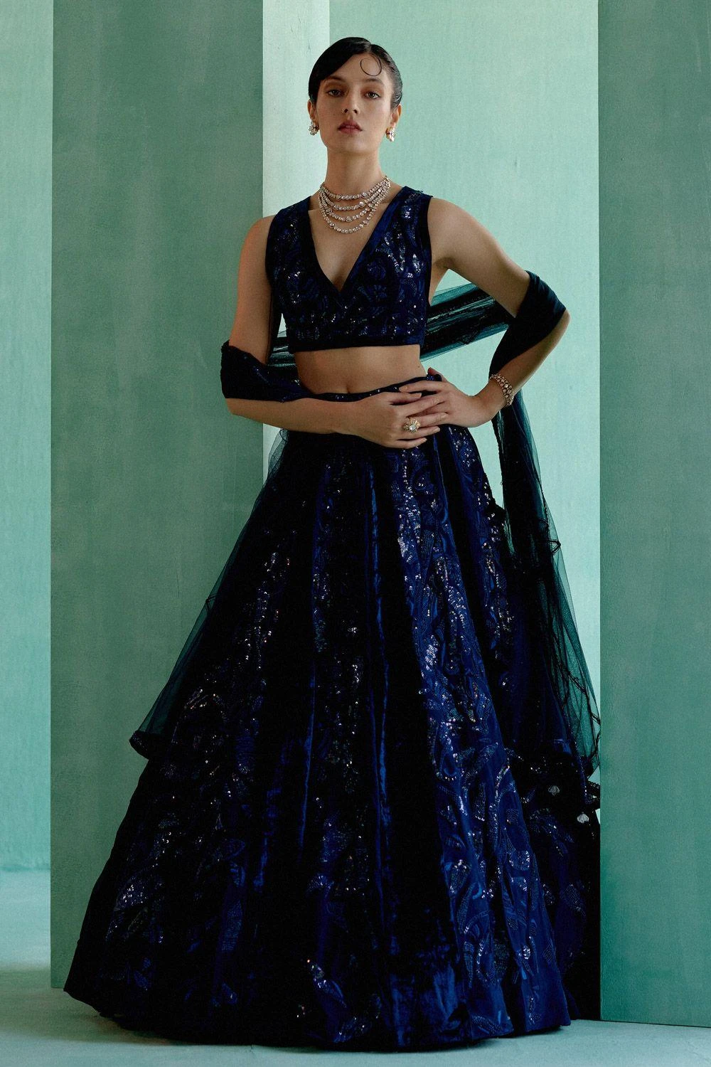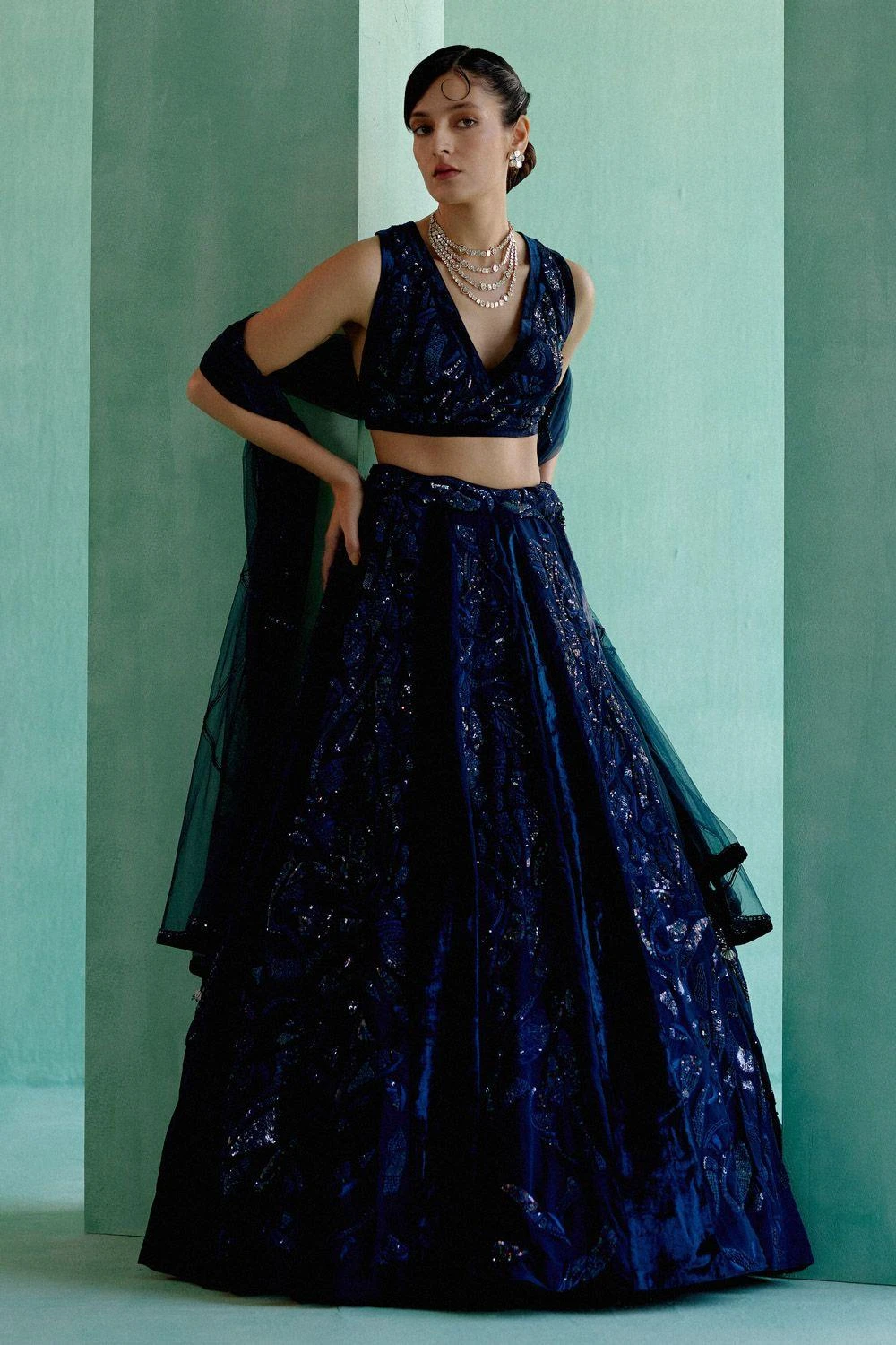 Adorn yourself in this water-embroidered panels lehenga set. This ensemble captures the essence of fluidity and artistry, creating a captivating and elegant look.