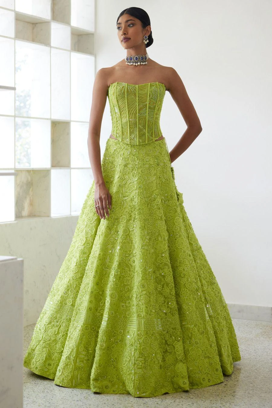Material/Fabric : Lehengaand dupatta – organza; corset- tulle