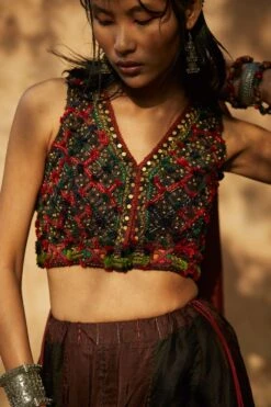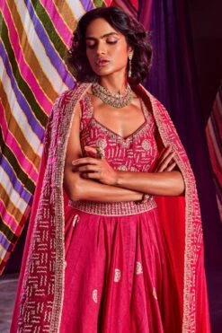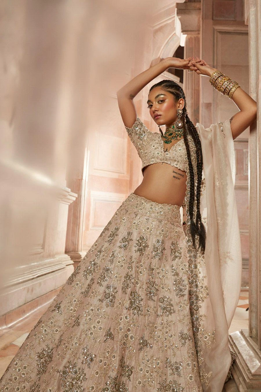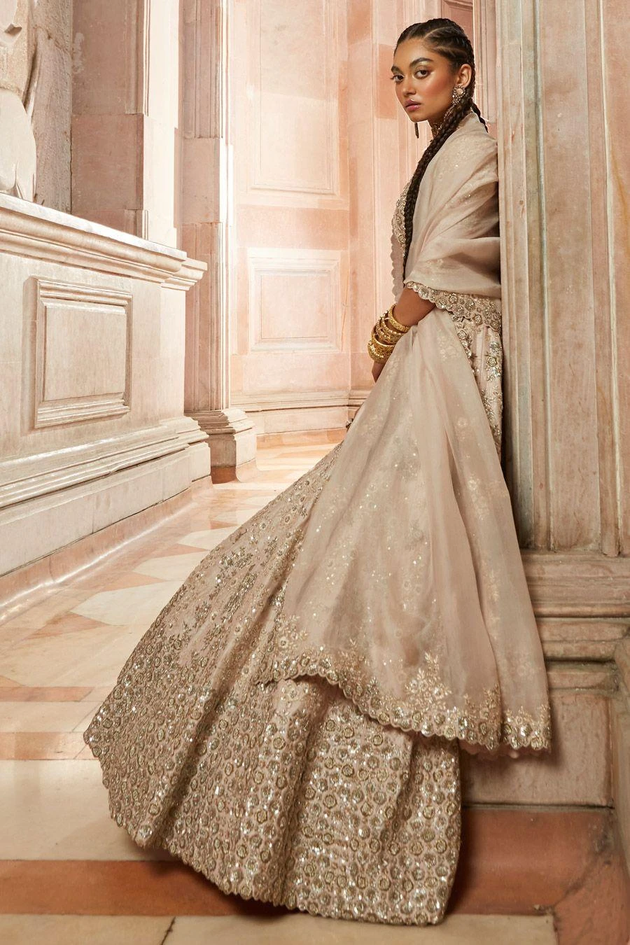 Add this ethereal ensemble to your wedding trousseau for an elegant look. This set comes with a zardosi embroidered lehenga with a heavily embroidered bottom paired with a pot neck blouse with detailed sleeves & an embroidered dupatta with butis.