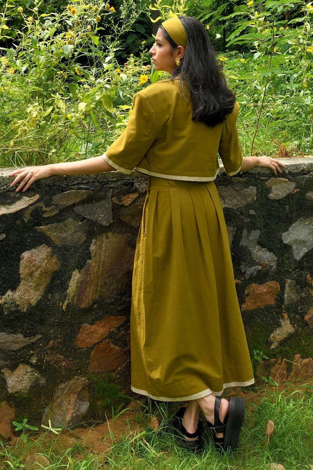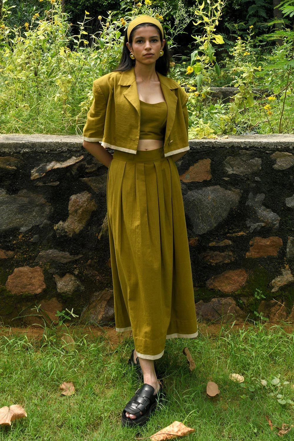 Cut in handwoven cotton, this bustier is a must-have for your closet. Pair it with a matching green skirt and a coat to complete this co-ord set.
