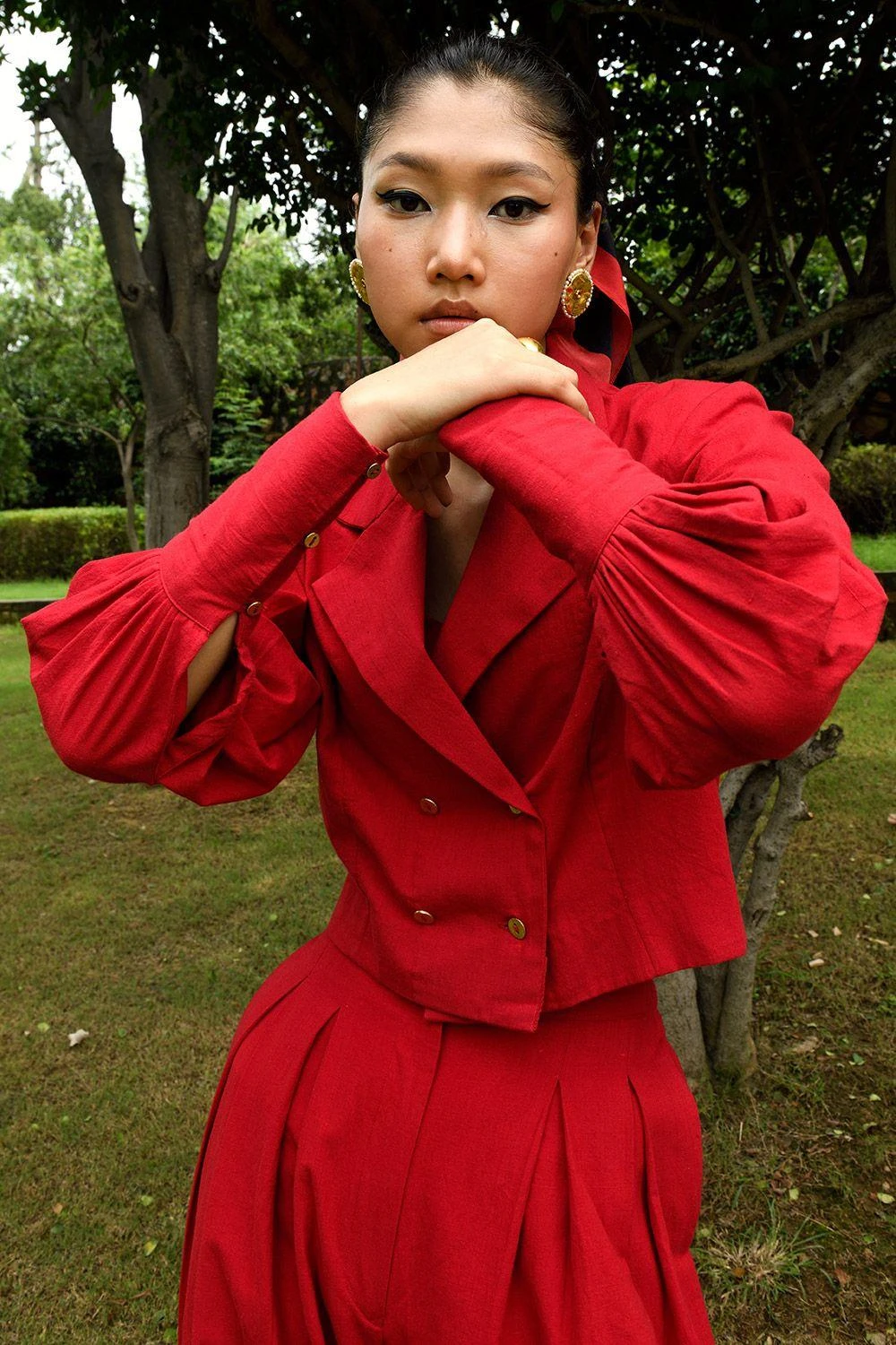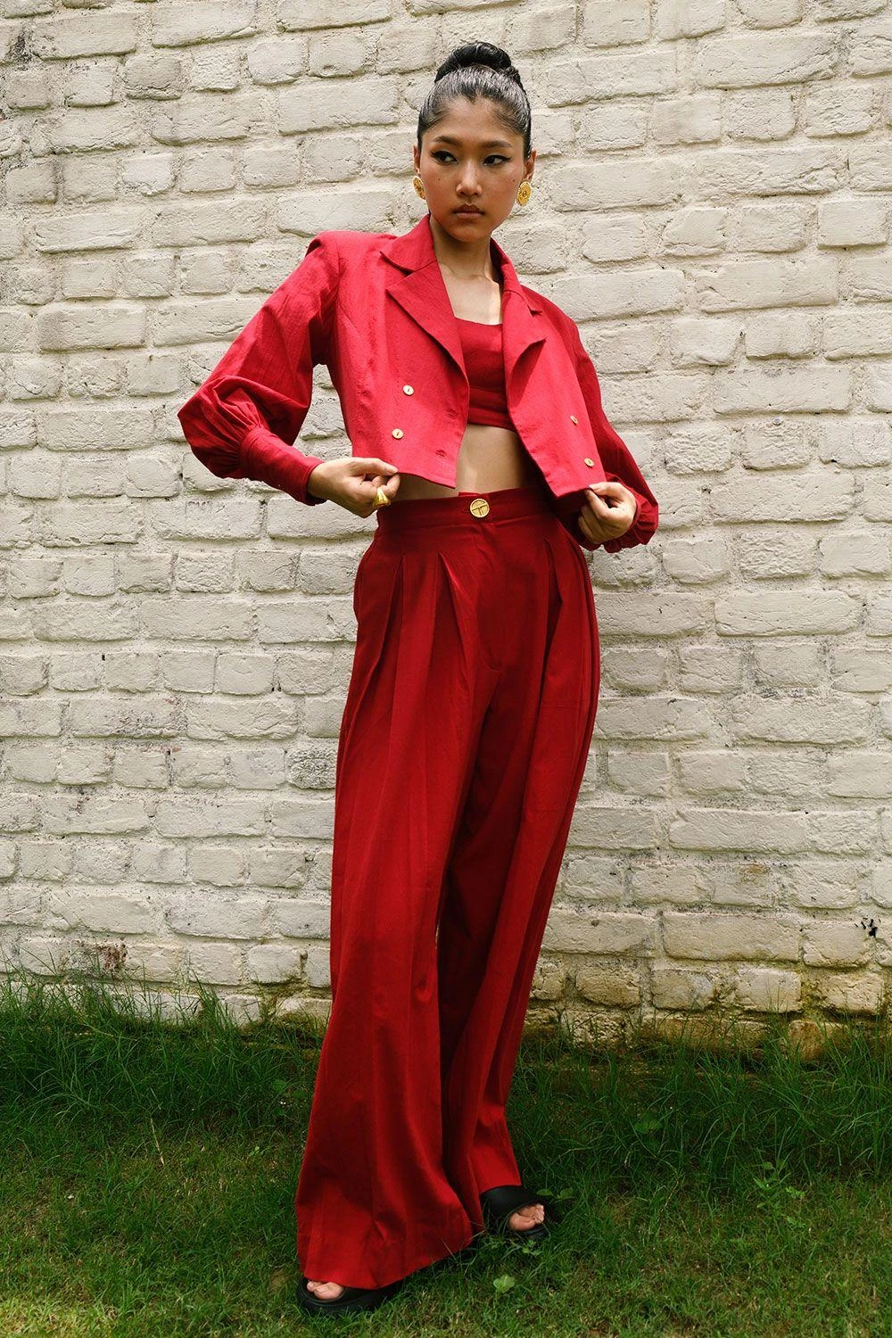Cut in handwoven cotton, these box pleated trousers are a must-have for your closet. Pair them with a matching red bustier and a coat to complete this co-ord set.