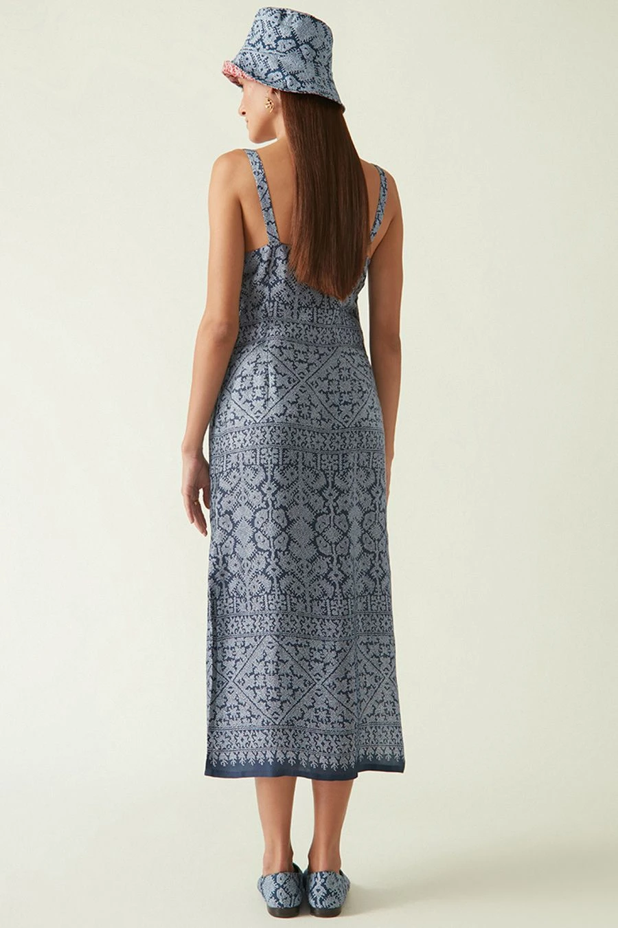 This navy slip dress falls in the realm of luxe minimalism. Crafted in modal satin, this strappy dress features a batik print all over. Style it with the wokam embroidered overlay from the collection to complete the look.