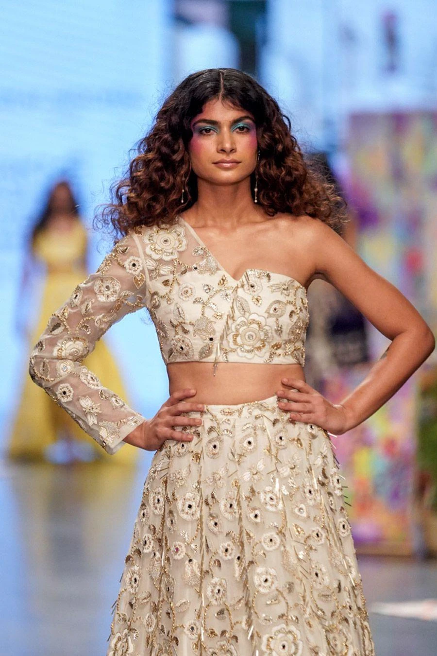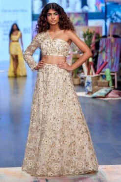 Payal Singhal’s runway collection finds inspiration in art from multi hued brush strokes & abstract art to miniature Mughal paintings. Crafted in organza, this set features an embroidered one shoulder top & lehenga.
