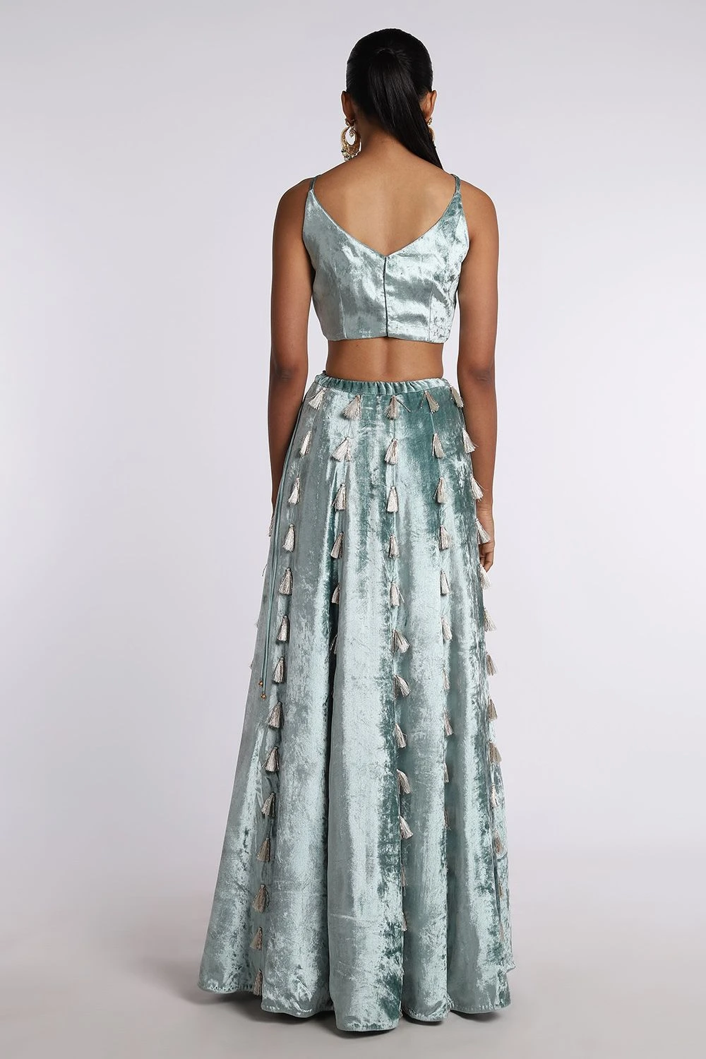 This embroidred short jacket, when worn with the velvet periwinkle blue bustier and this lehenga with tassles is a fresh choice for daytime festivities.