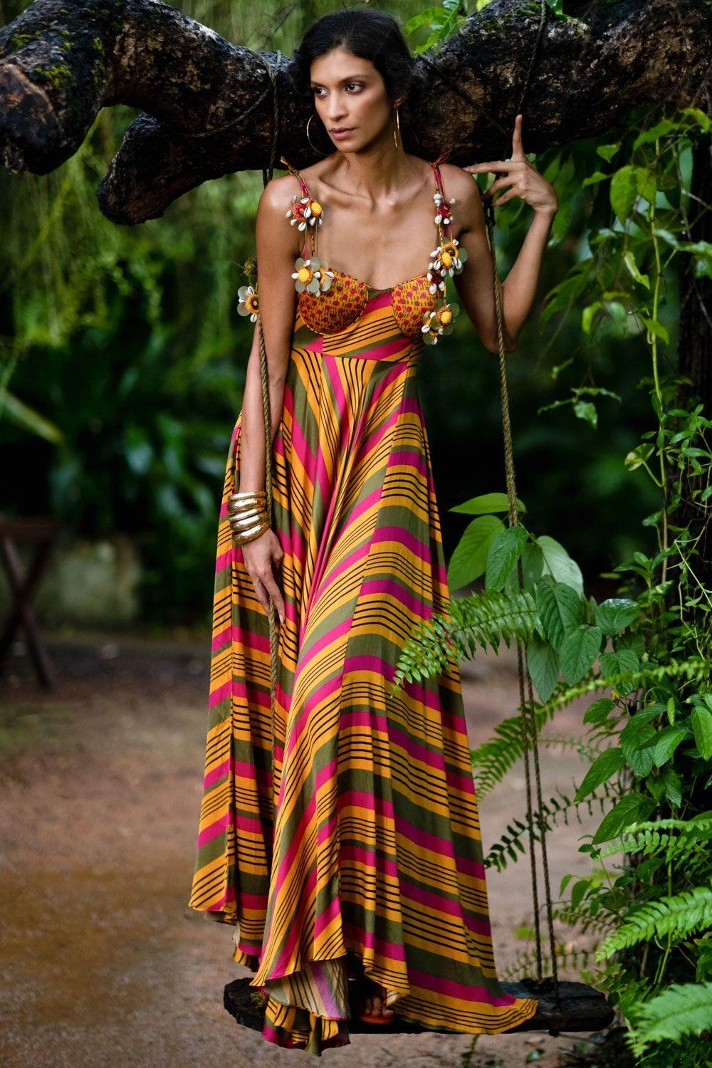 Make a fire statement in this absolute stunning mustard maxi dress. It is cut in sumptuous satin silk and engineered with a fitted corset like bodice and flows down to a beautiful skirt. The whole look is accentuated with embellished leather tassels.