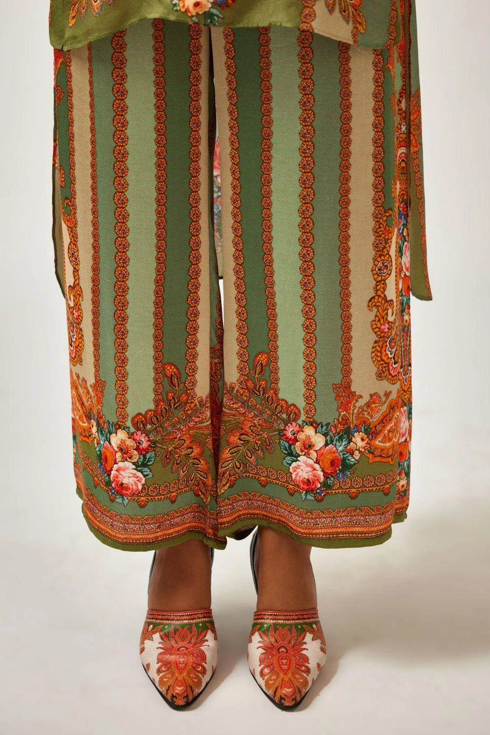 Indulge in style with the green stripe printed pant. Front belt detailing and back elastic combine fashion and comfort seamlessly, ensuring a fashionable statement for any occasion.