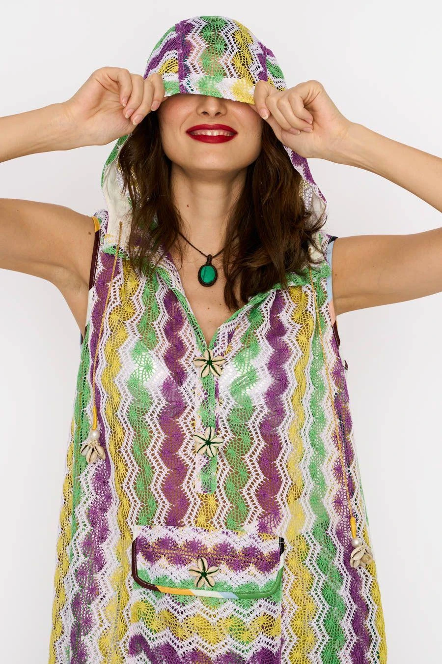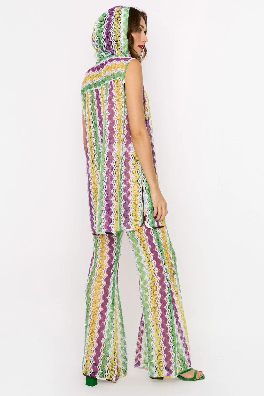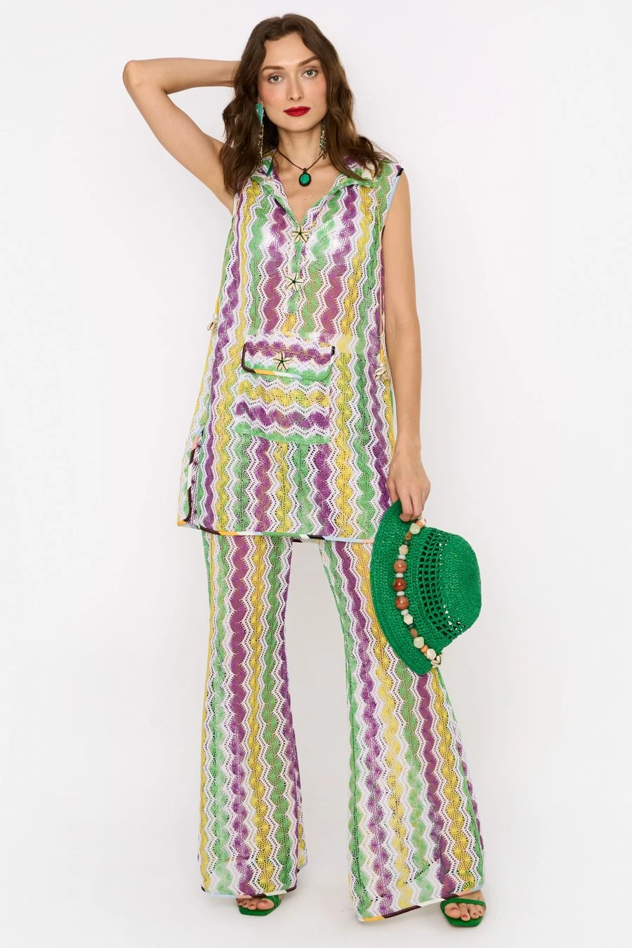 Crafted in viscose, these flared crochet pants feature a sinuous pattern all over. Pair it with the Purple sheer cover up top from the collection to complete the set.