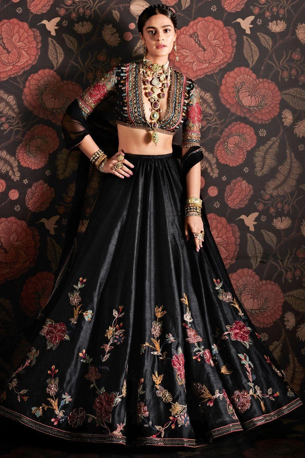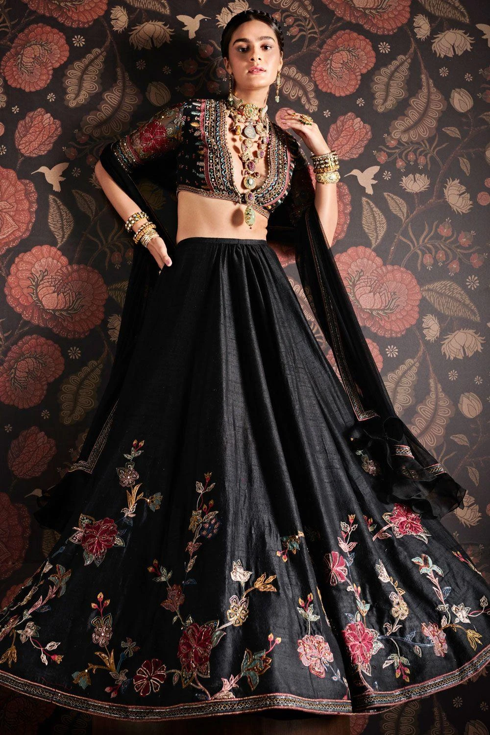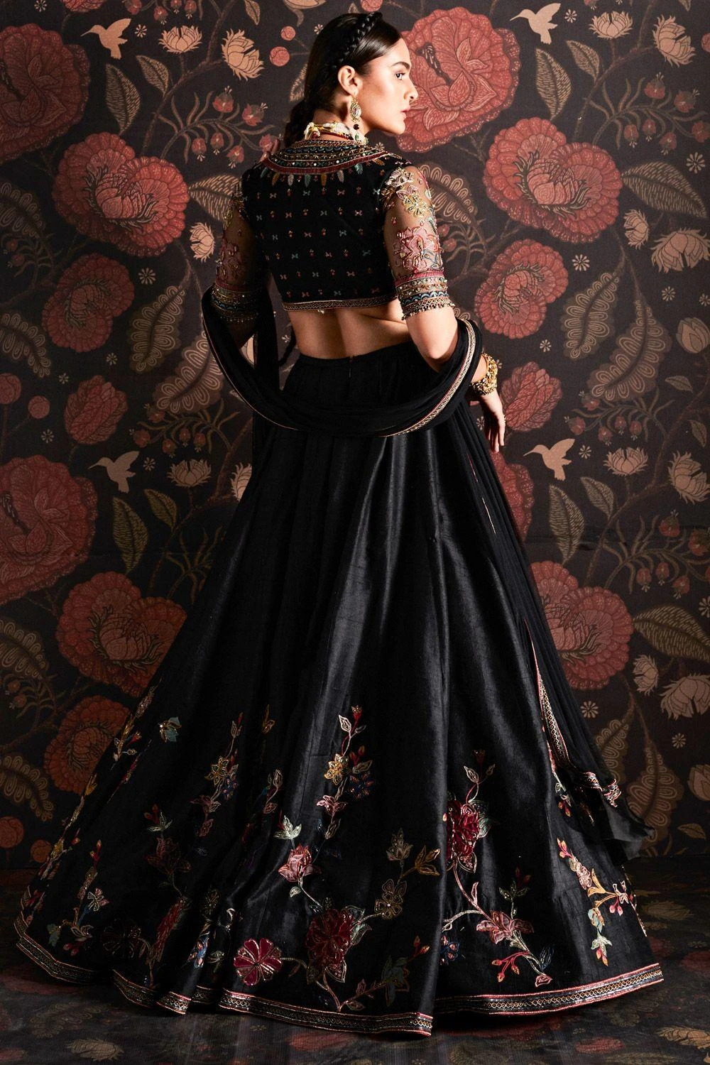 This festive black lehenga with coloful floral threadwork is perfect for an evening wedding function. The fully embroidered V neck blouse & lehenga is set in a raw silk fabric with a net dupatta.