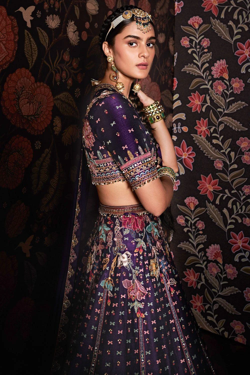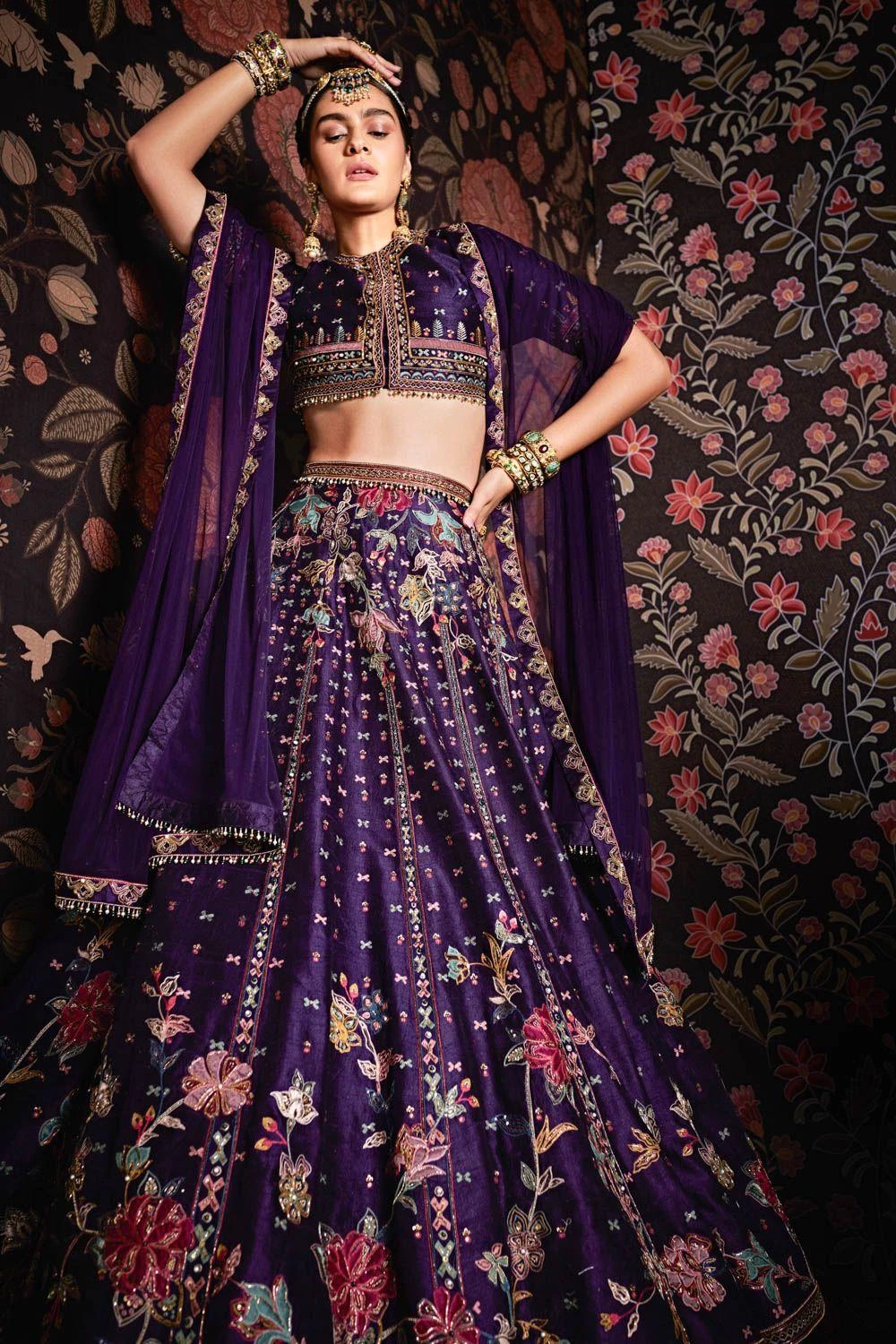 The delicate embroidery on the raw silk lehenga, the matching embroidered blouse, net dupatta & matching belt make for the perfect set. Style this piece with a choker & statement jhumkas for a festive evening look.