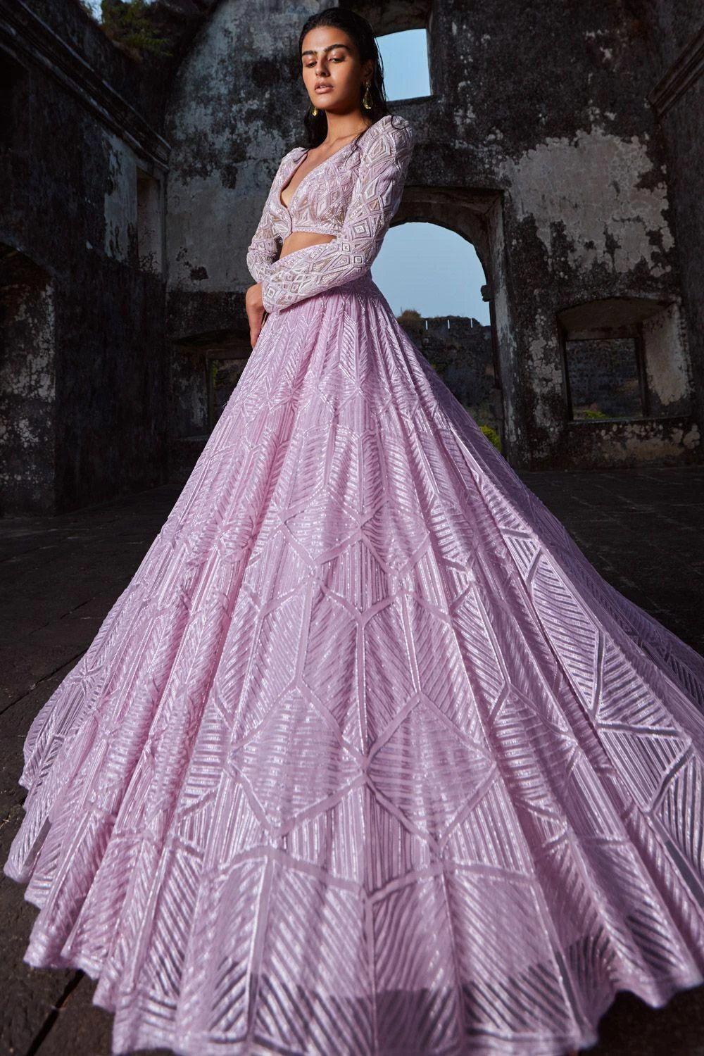 This elegant lavender hand embroidered lehenga set comes with a fully embroidered full sleeved blouse. The statement shoulder & V neck adds a modern element to the lehenga. Style this set with chandbalis for a sangeet.