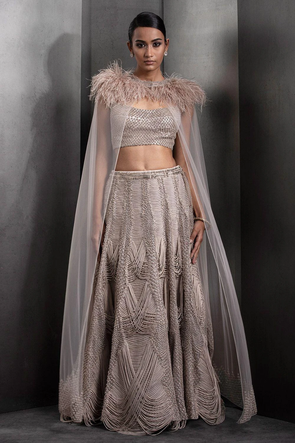 Experience sheer opulence in the fully embellished lehenga adorned with meticulously stitched cords & delicate organza fray, harmoniously paired with an ethereal crux star blouse & graced with an elegant long feather-sequin cape to complete the look.
