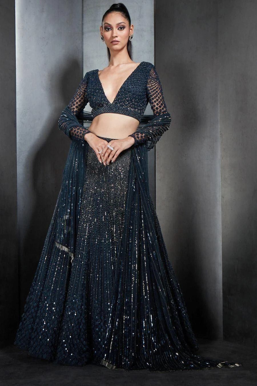 If you’re looking for a head-turning statement-making lehenga set this is the outfit for you. Crafted in tulle, this set features a cutdana lehenga paired with a V-neck geometric artwork embroidered blouse.
