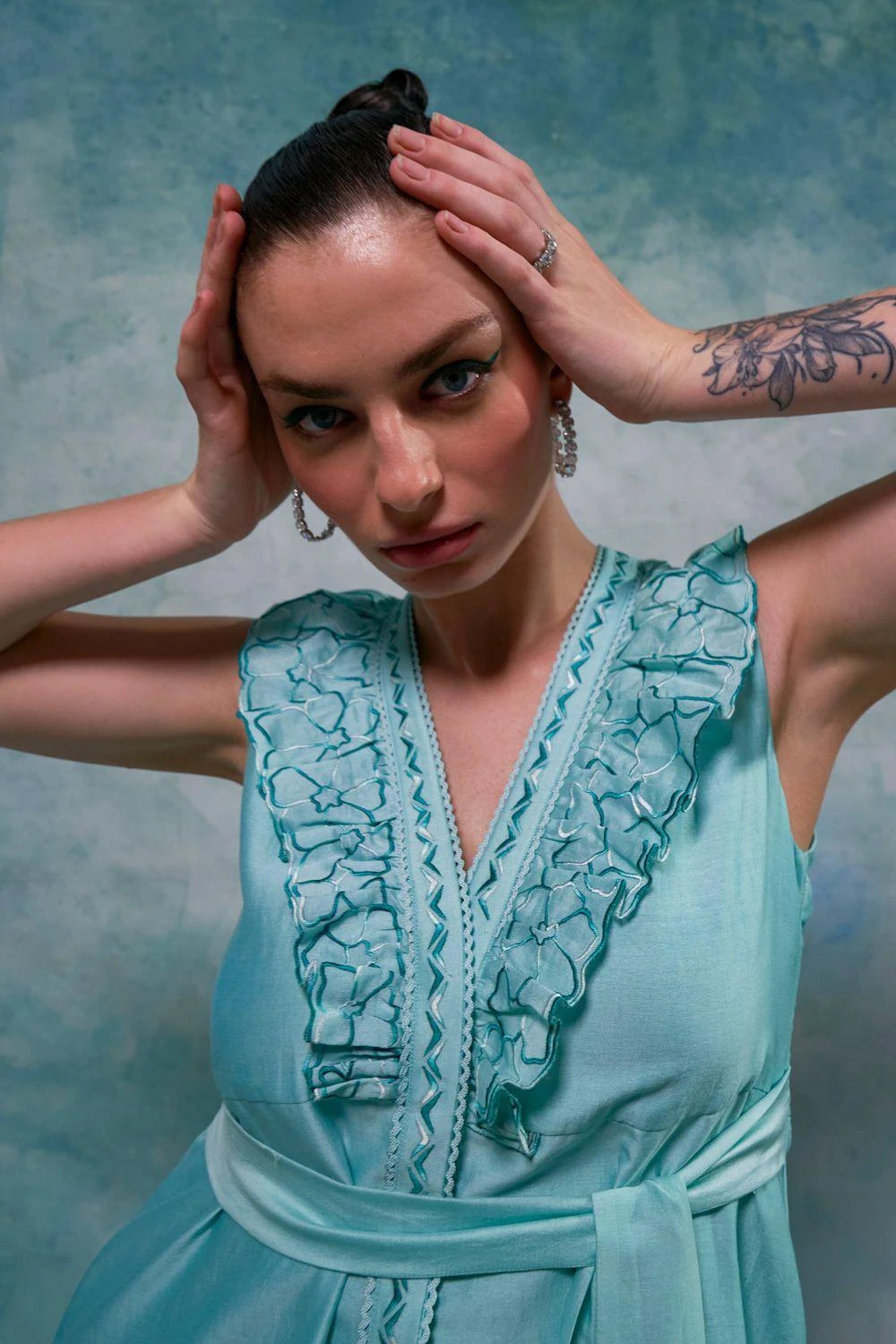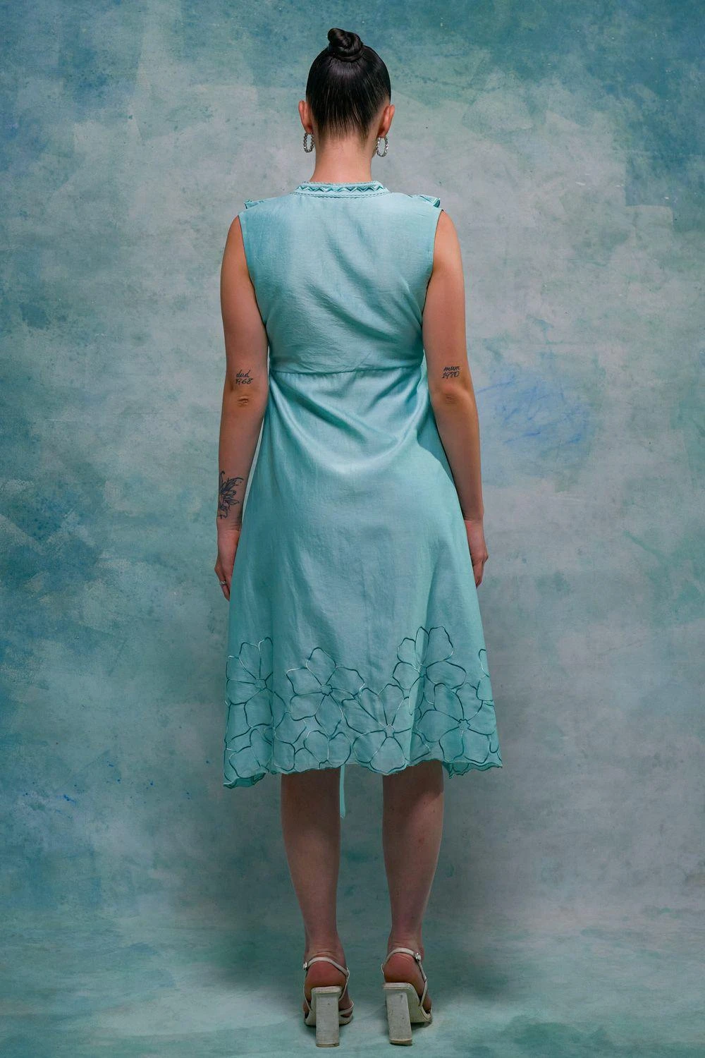 Step into sophistication with this sleeveless midi dress. The V-neck with embroidered ruffle trim exudes elegance, while the detailed button-up front adds a touch of charm. Elevate your fashion game with this versatile and chic dress.