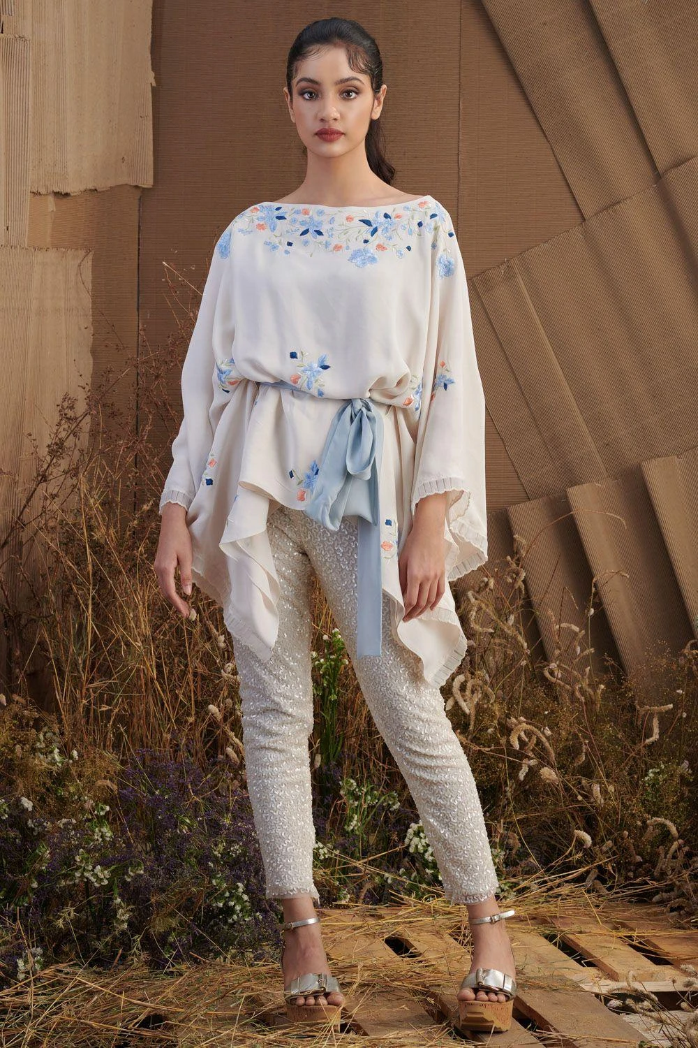 This stunning embroidered kaftan top has a floral embroidered boat neck. The top comes with a tie up belt for a flattering silhouette. Style this piece with fitted trousers for a chic daytime outfit.