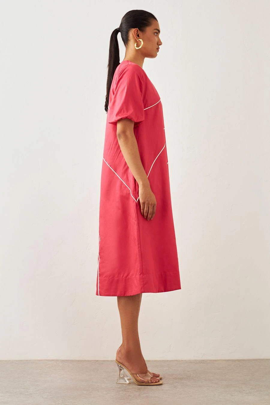 From your work desk to the brunch table & from lounging at home to catching flights, you can always count on this dress. Crafted in cotton, this dress features voluminous sleeves with a contrast curved piping detail.