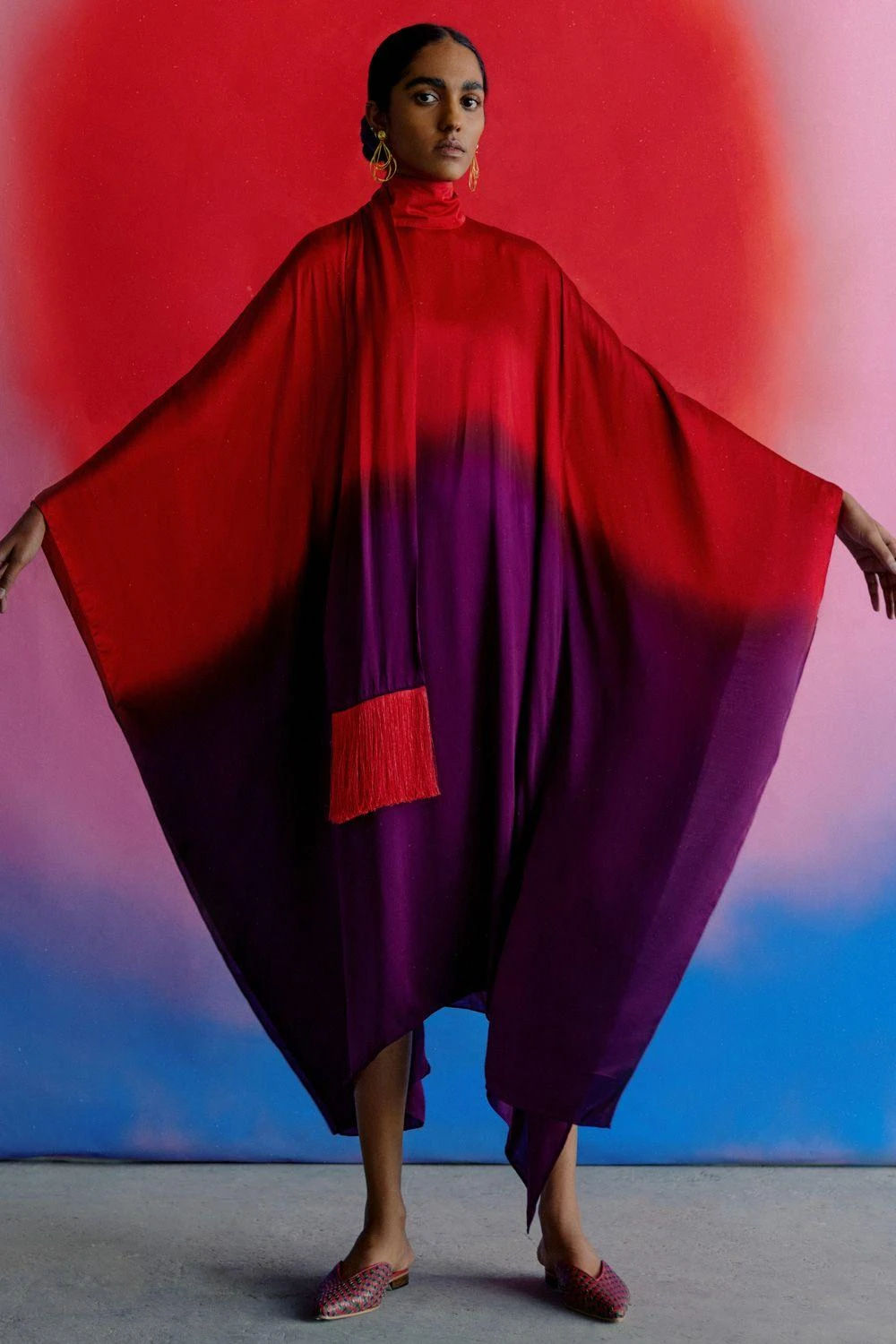 This red & purple leheriya round collar dress is consciously crafted in vegan silk in an elegant ombre palette. This trend-setting piece features kimono sleeves with fringe detailing. It ends above the thigh and drapes on the body.