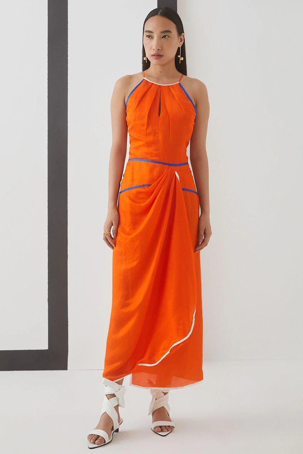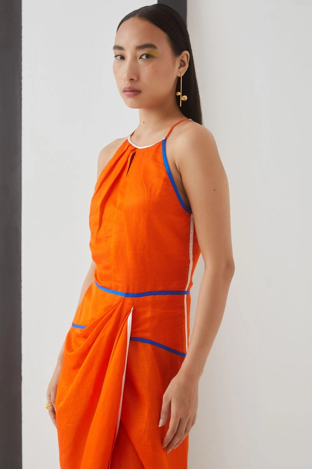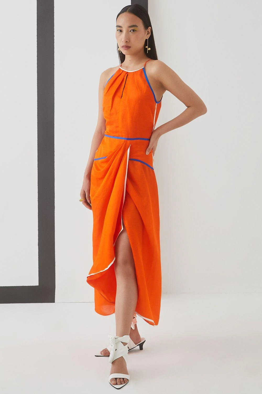 Envisioned for a luxurious getaway, this dress embodies laid back vacation style. Crafted in linen satin, this dress features a halter neck with a draped skirt look & a concealed zipper. Style it with a pair of heels and to complete the look.
