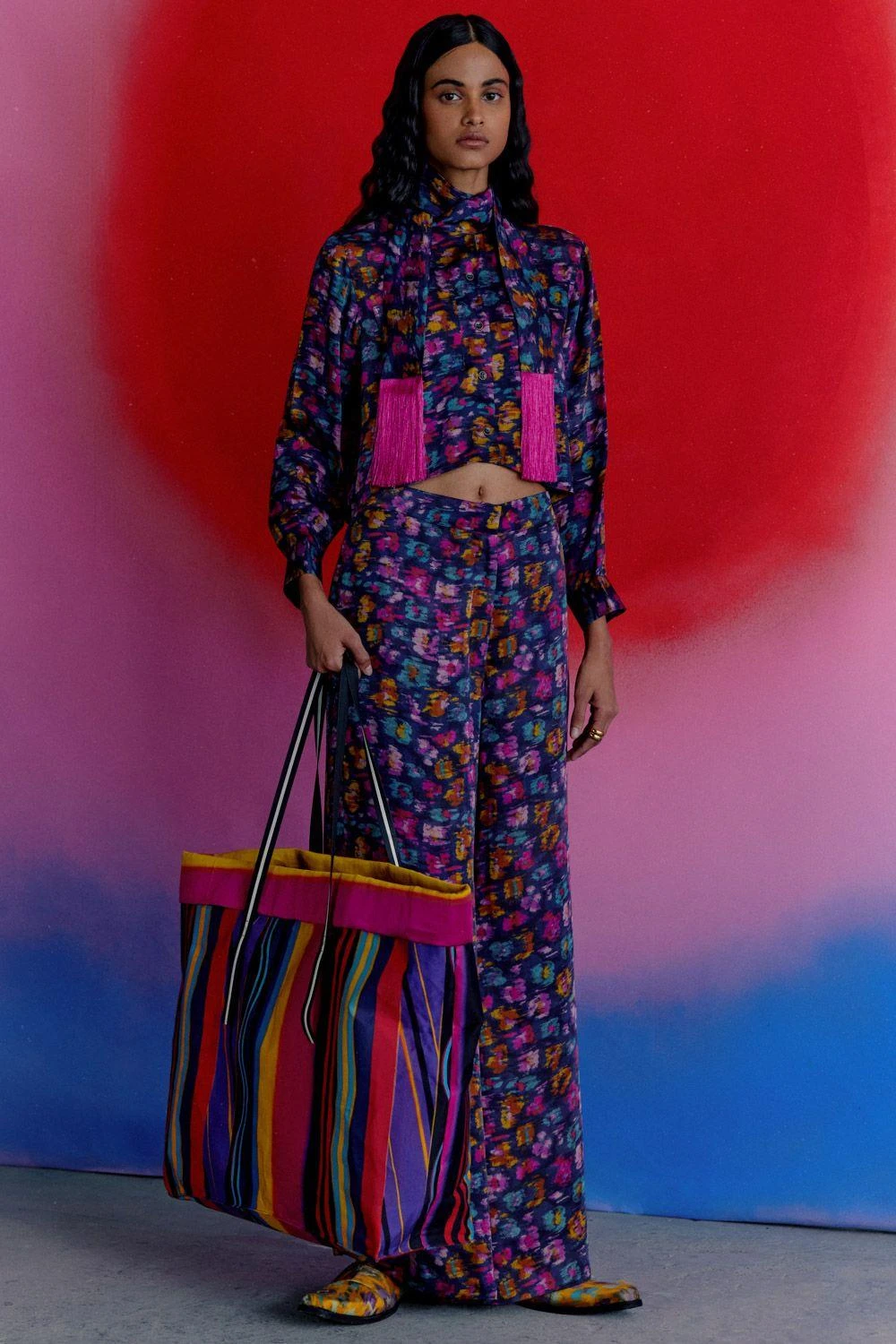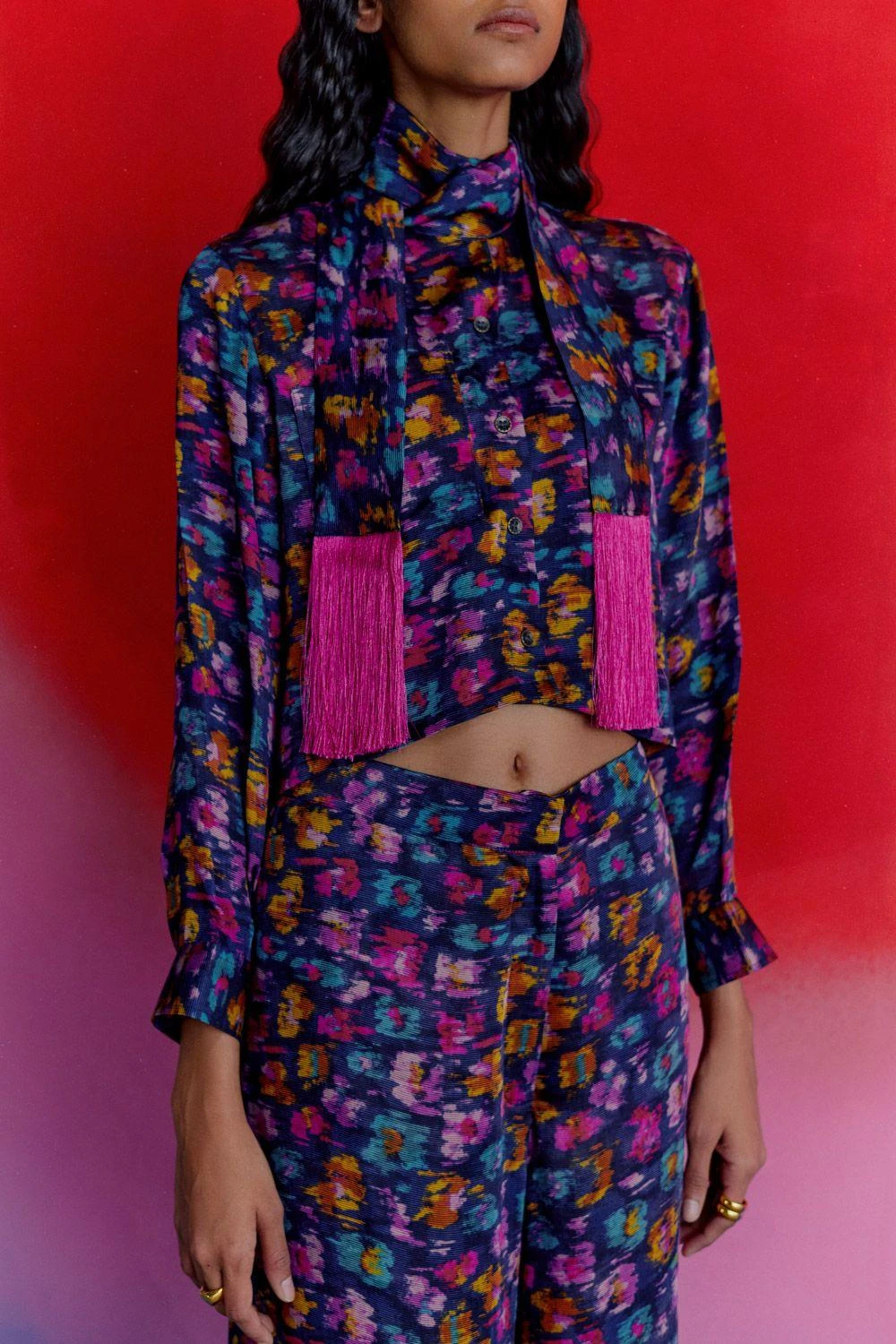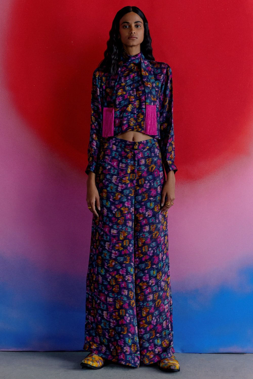 These warlow trousers are mindfully crafted in digitally printed vegan silk. The eclectic print resembles an abstract painting, making it a trend setting piece. Team it up with a coordinating shirt from the collection for a statement look.